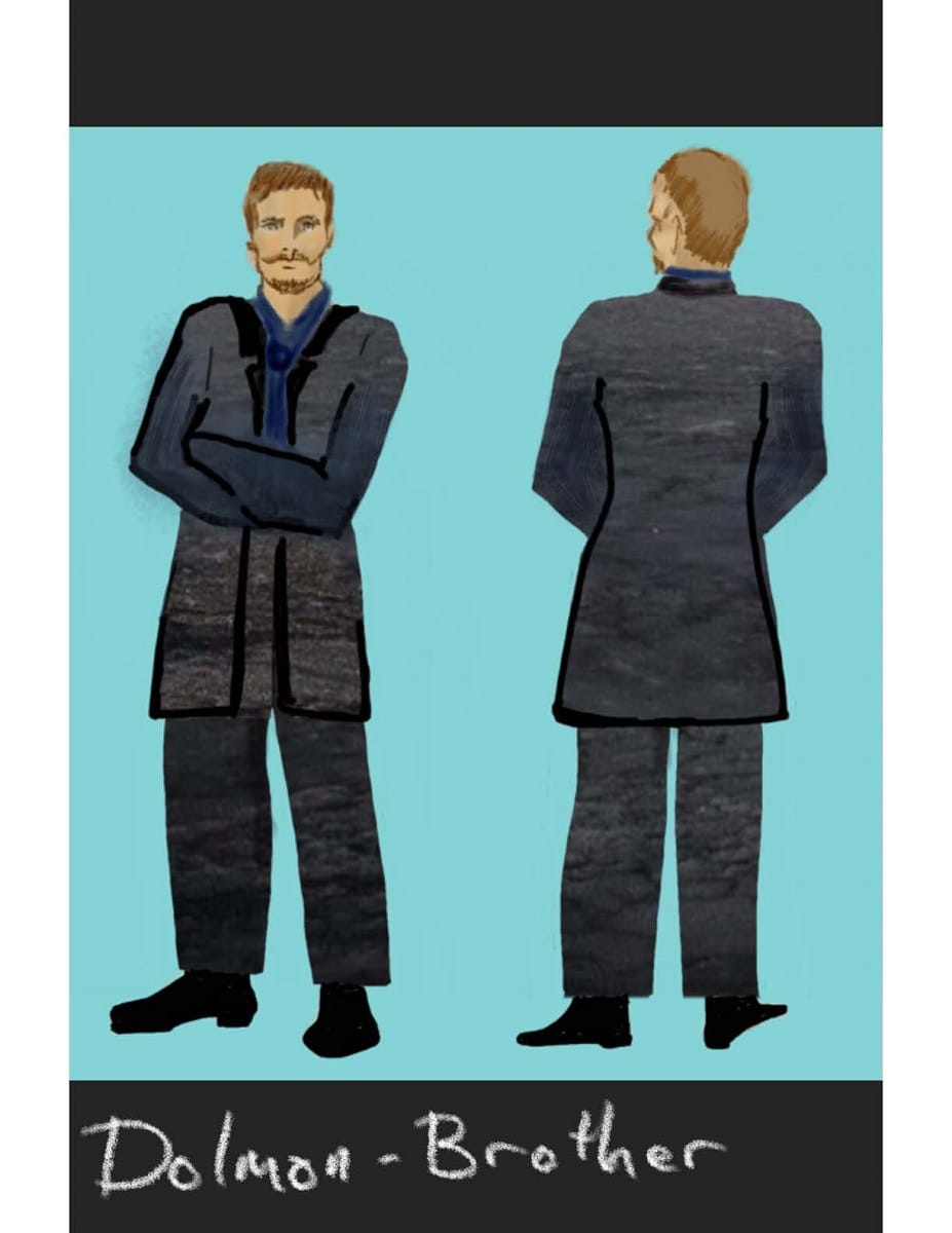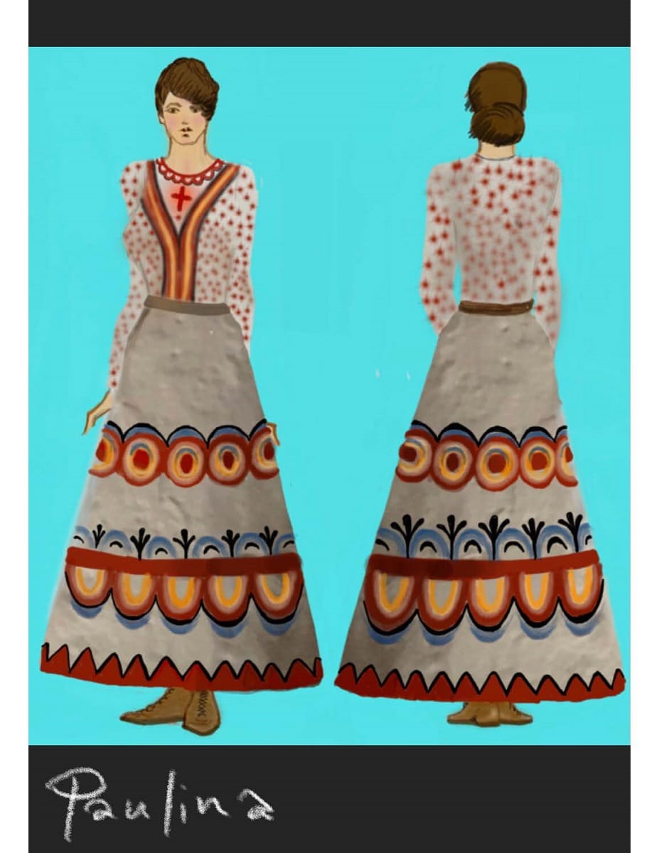 The opera will debut a public dress rehearsal at Taos Center for the Arts (TCA) on May 26, which includes a first look at costumes created by local fashion designer Patricia Michaels, or Water Lily (Taos Pueblo). Clearly grounding her inspiration in New Mexico, Water Lily drew from the state’s Spanish colonial and Catholic cultural histories. Referencing popular devotional figures such as San Ysidro (or Saint Isadore), the patron saint of farmers, with his wide-brimmed black hat and humble cotton clothing, and popular representations of Nuestra Señora (Our Lady) with her intricately patterned and wide-bottomed dress often seen in carved polychromatic sculptures (or bultos). The designer also makes a clear class distinction by adorning the opera’s antagonist in black business attire, highlighting his impersonal connection to the landscape and the people who work it.