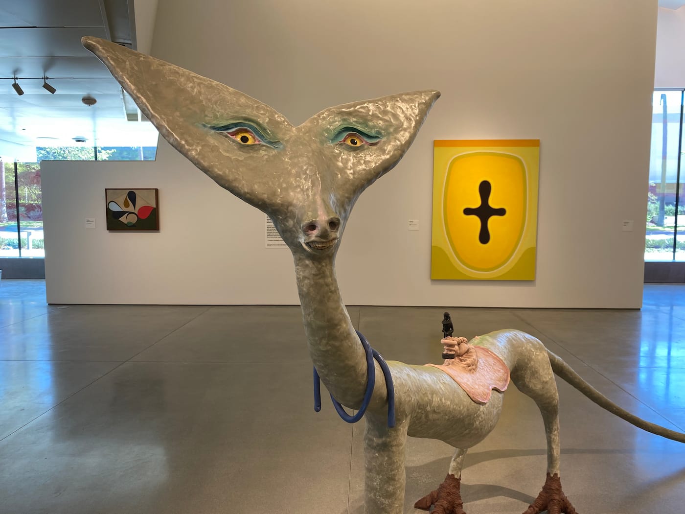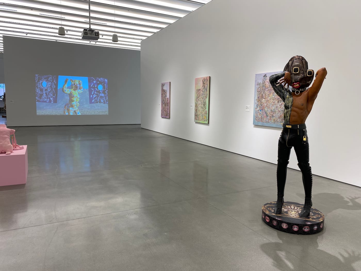 Although not technically part of the biennial, a commissioned sculpture by Sanford Biggers, “Of Many Waters…,” seems of a piece, welcoming visitors from its perch in the elevated plaza. Made up of shimmering sequins reminiscent of roadside signage common in Southern California, it depicts a reclining figure holding a cornucopia, its head made up of two African masks. This sense of inclusive multiplicity is at the heart of the museum’s mission according to Zuckerman. “People want to be able to see themselves in the institution,” she said.