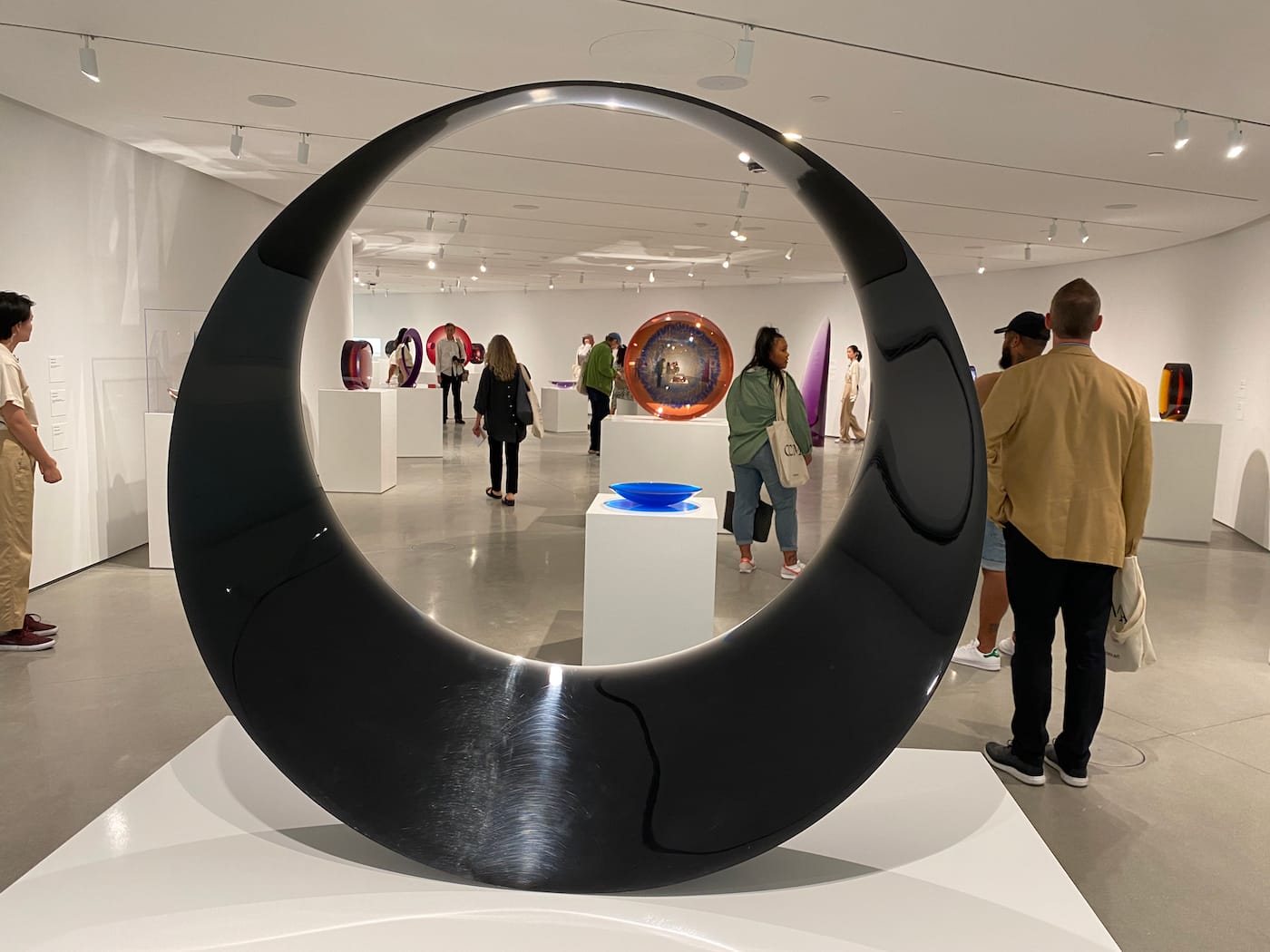 The mezzanine gallery features a survey of radiant polished acrylic and resin sculptures by Light and Space pioneer Fred Eversley, who had a seminal exhibition at the Newport Harbor Art Museum in 1976. Playing with color, optics, and luminosity, Eversley’s works must be seen in person to appreciate how they change as the viewer moves around them — a challenging feat in the museum's mezzanine, where both space and light are limited. Similarly, a crowd squeezed through a small exhibition focused on the parallels between Peter Walker's landscape designs and Minimalist artworks by Sol Lewitt and Frank Stella that is laid out on the landing between staircases.