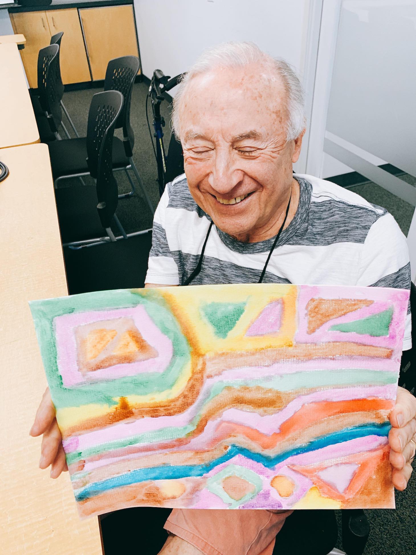 These art sessions, called “Memories in the Making,” happen monthly. Selly Jenny, an artist and advocate from Newport Beach California began the “Memory in the Making” program at the Orange County branch of the Alzheimer’s Association in 1988. Jenny’s mother, who had died in 1984, suffered with Alzheimer’s and Jenny became interested in how creative expression, like visual art, could help trigger memories buried by the disease. The program later spread across Greater Los Angeles and then the rest of the country. Studies since have shown that art-making does help by giving Alzheimer’s patients something outside of language to focus on, stirring up memories. In “Memory in the Making” sessions facilitators always ask questions: What was fall like where you are from? Do you remember the colors of the leaves?