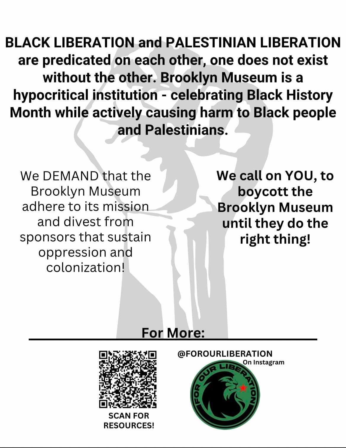 "We did not come to disrupt or to diverge or shame the masses from attending this event — we wanted to educate the people on who was sponsoring this event and the Brooklyn Museum, how its funding directly contributes to the oppression we face every day nationally and internationally, and drew the intersections between the Black struggle and the Palestinian struggle," they added.