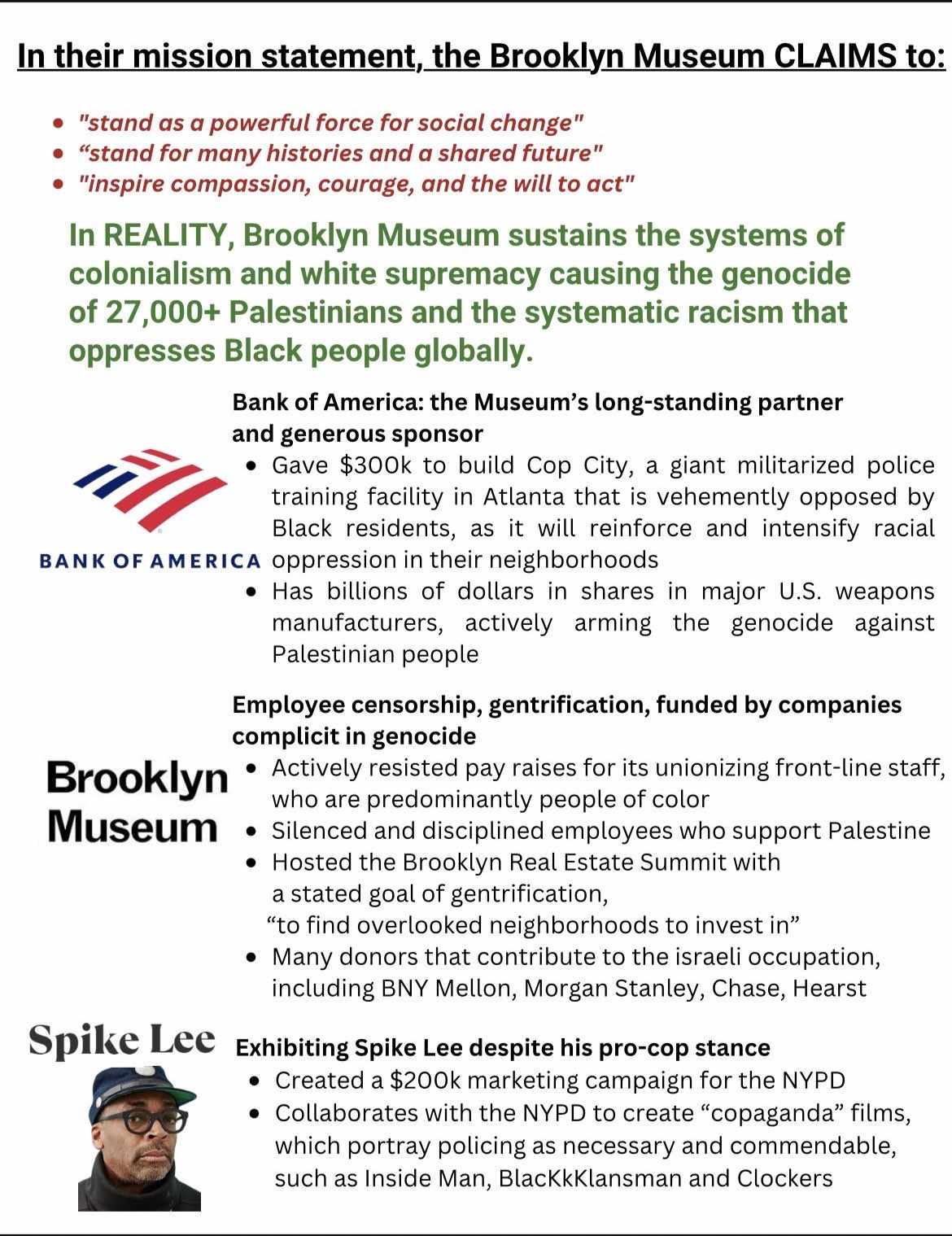 One flyer drew attention to the corporate sponsors of the Brooklyn Museum that have financially contributed or shown support to the Israeli military and specifically singled out First Saturdays sponsor Bank of America for its funding of the "Cop City" police training center in Atlanta, Georgia. The materials also highlighted the widely criticized 2015 Brooklyn Real Estate Summit held at the museum and its alleged role in gentrifying the surrounding neighborhoods in the borough as well as its long-winded negotiations with unionized staff. The other page encouraged people to connect with FOL and boycott the museum until it divests from sponsors that back Israel.