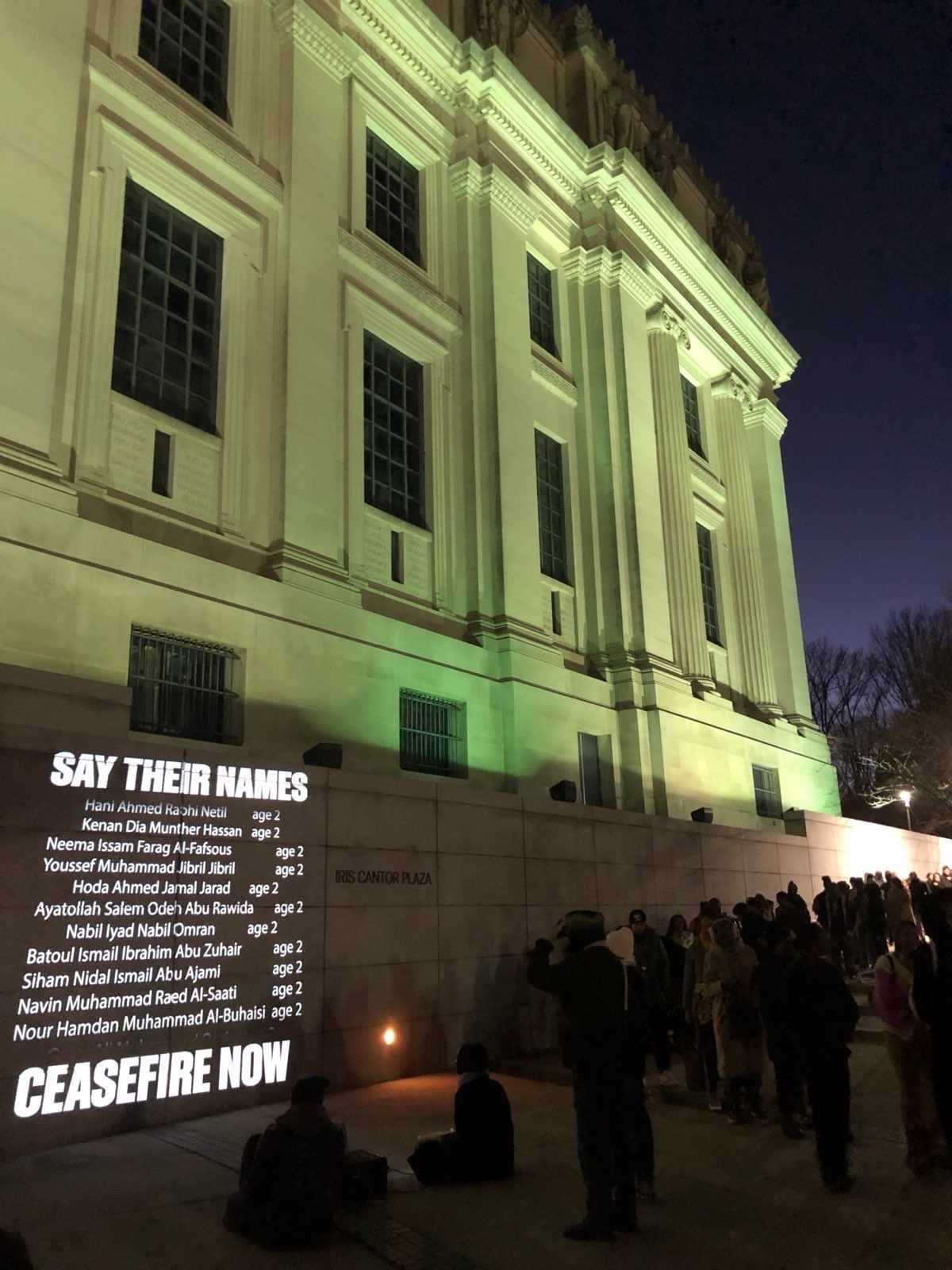 The demonstration, which lasted about an hour on Saturday evening, was staged by a local, Black-led communist collective called For Our Liberation (FOL). Approximately 10 organizers projected the names of Palestinian civilians killed by Israeli airstrikes on the museum's exterior while a group of three entered the museum and managed to distribute flyers to visitors for approximately 30 minutes before museum security began to escort them out.