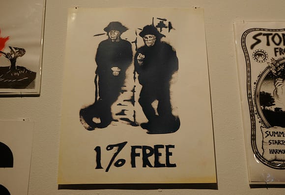 Posters, another prominent element of street art, also began to be used in an anonymous and nonconformist way in the 1960s due to their easy reproduction. An added feature of this form was that the creator had the luxury of being able to be produce the posters in private while being able to post them in public very quickly. A good example of this poster trend is the “1% free” (1967) offset lithograph by the San Francisco Diggers. This large poster, originally a 3-foot wide and 6-foot tall, was pasted on the walls of San Francisco during the period. The image depicts two Chinese assassins patiently waiting beneath a sign with the I Ching character for revolution. “1% free” was a slogan the Diggers used, part of their maxim that “everything is free because it is already yours.”