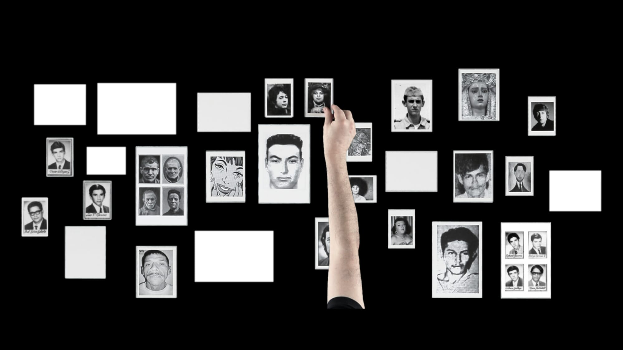 The artist’s own face appears in a number of works. In “El juego de las probabilidades" (The Game of Probabilities) (2007), 12 color and black-and-white passport photos taken at different points in his life are cut and spliced together into new combinations. Each face represents a disorienting collapse of time, and raises questions about how much of ourselves continues or changes with time. The composite collages are photographed up close, held by the artist’s fingers, suggesting a sense of intimacy but also hinting at the smallness and randomness of our own existence.