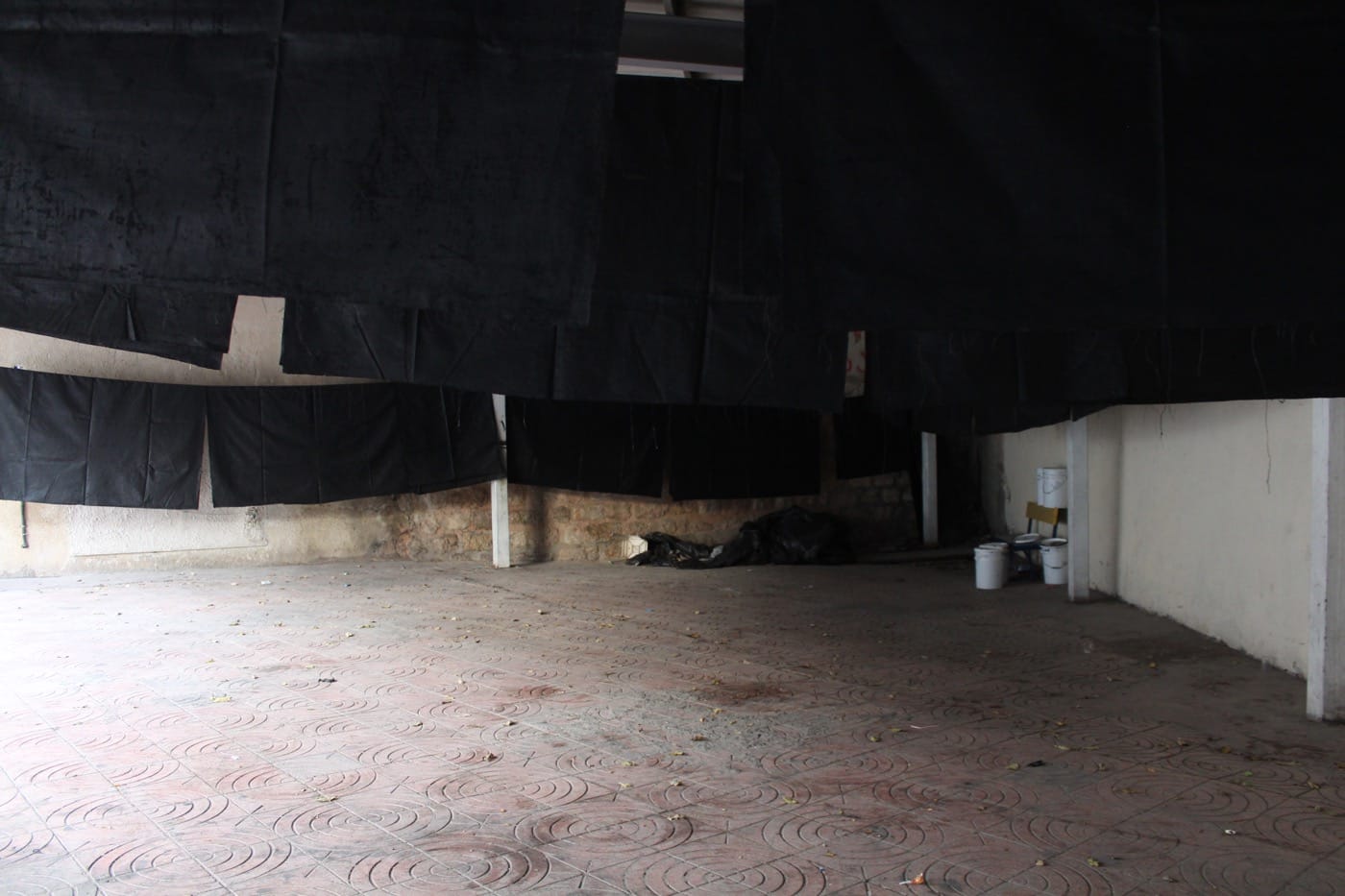 The black canvases were painted and hung, and in the harsh afternoon sunlight, take on the sheen of an oil slick. Some remain folded in piles on the ground, surrounded by upended plastic chairs and scattered rubbish. At once, the black canvases confront and confound the Israeli flags and crisp white laundry that flutter from balconies overhead — one wonders what the response to this installation might be on the other side of the wall. Here the black flags function, as Murillo puts it, as a type of “silent witness” to the situation progressively unfolding around the club’s perimeter. Most importantly, they speak to how the realities of the community are relayed through time spent.