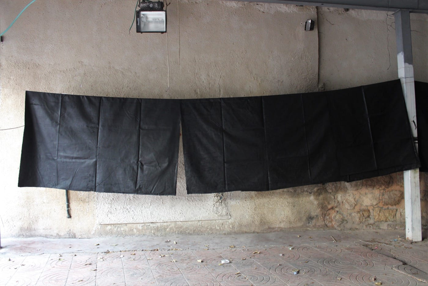 EAST JERUSALEM — At the end of a narrow alleyway in the East Jerusalem neighborhood of Ras al-Amud, a maze of hanging black canvases have obscured the Silwan Club’s concrete courtyard. They are the size of bed sheets — draped over clotheslines, hung in layers around the community center’s small outdoor space. Their fraying ends hang down under the metal roof, below eye level, and form lines dividing the club’s tiny garden — a contemporary art installation with no visitors, in the unlikeliest of places.