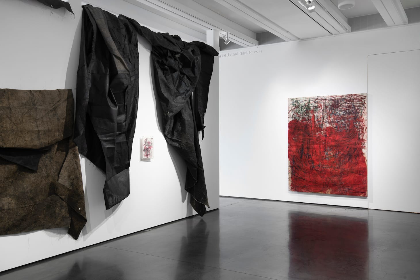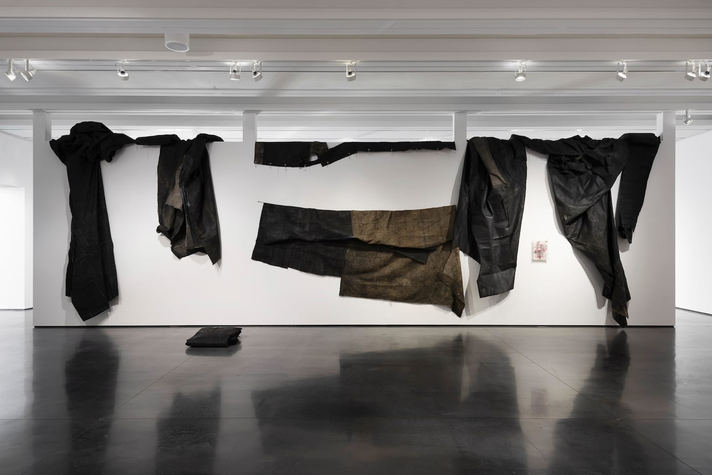 One black canvas is incorporated into Murillo’s video performance, Industrial Park, which he filmed in Aspen in the summer of 2019 and which plays on a monitor in the corner of the gallery. In the film, Murillo swims through a river by the local Hunter Creek Trail, then crawls under the canvas on the riverbank. A woman’s voice narrates quotes from Brazilian avant-garde writer Patrícia Galvão’s Parque Industrial, which describes the female experience of living in 1930s São Paulo. “In the dirty latrines the girls spend a joyful minute stolen from the slave labor,” she says while Murillo heaves his body under the canvas, crawling through the surrounding foliage, “A shoeless foot is cut on the shivers of a milk bottle.” For Murillo, nature offers a reprieve from the suffocating forces of social inequality, until it doesn’t. In a field, the tarped artist discovers a blush chez lounge leaning against an upturned tree. He stuffs it with boulders until it bulges at the seams. The woman’s voice describes how the rich can sleep endlessly, and Murillo stuffs the couch for what feels like an eternity. When he’s finally done, he drags his canvas back to the riverbed and allows his body to be carried downstream. Murillo leaves the canvases out by the river to absorb the energy of their surroundings.