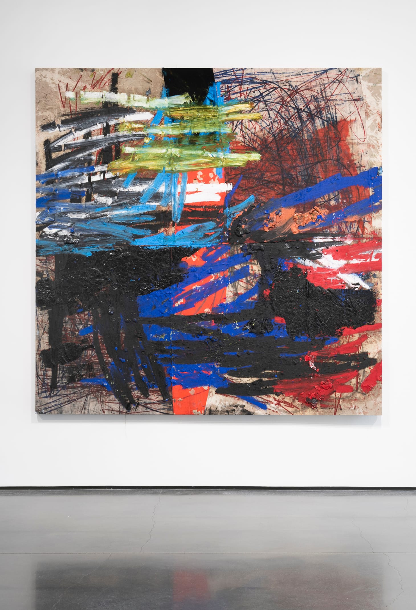 For Murillo, this gestural instinct is rooted in the physical experience of drawing. In his catalyst series, he layers canvases on the floor and uses a broom handle to transfer marks between them, gathering the force of his entire body to maneuver paint around the cloth in seismic motions. When the body moves, it attempts a gesture of autonomy, of rebellion against the structures that confine it. He considers these pieces “recording devices” for downloading and holding physical energy. Similarly, in his series titled manifestation (a word tied to political protests in several languages), canvases are soaked in pigment and layered with a collage of oil paint, graphite and written letters, which are then erased under additional layers of paint. In these scrawling, seductive tantrums, Murillo examines the raw form of mark making, in what he refers to as a “flooding of the surface.” The works speak to that which is buried, that which is nearly drowned but manages to stay alive. The strata of power, which, for the artist, often points to class divisions in a capitalistic world, is nodded to in the layers of his thick paintings, pieces obscured from the viewer. The works are simultaneously frenetic and anchored; they feel like a storm that’s found a place to land.