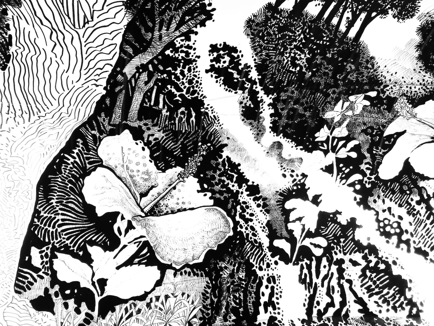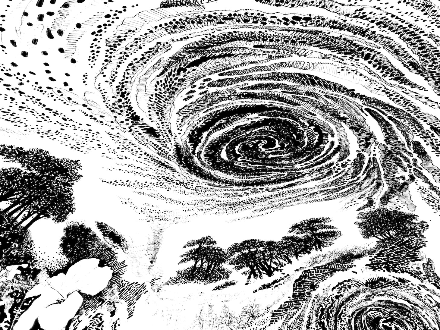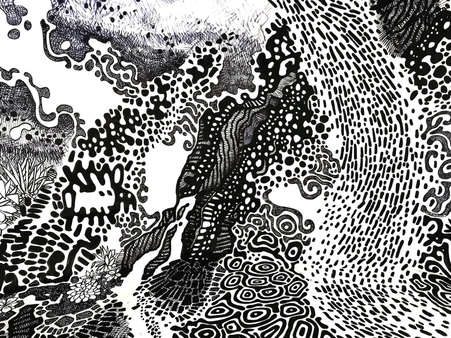 If any comparisons make sense, Oiwa’s style immediately brought to mind Google’s DeepDream, a program powered by a neural network that picks up patterns in images — pixels that might resemble a human face or a dog’s tail, for example — and repeatedly processes them until they have been distorted and amplified in surreal, sometimes nightmarish, ways. Oiwa’s landscape is far too tranquil to be mistaken for the software’s creation, but his line work warps into natural elements quite often. A recurring pattern of rippling, oblique circles resemble hundreds of eyeballs that follow you through the dream space; rabbits emerge from black voids, plant life springs out of stippled marks, and reptilian creatures emerge from hatched lines. The ornate, decorative patterns conjure Art Nouveau illustrations by Aubrey Beardsley and Harry Clarke, but “Dreams” distinctly belongs to Oiwa.