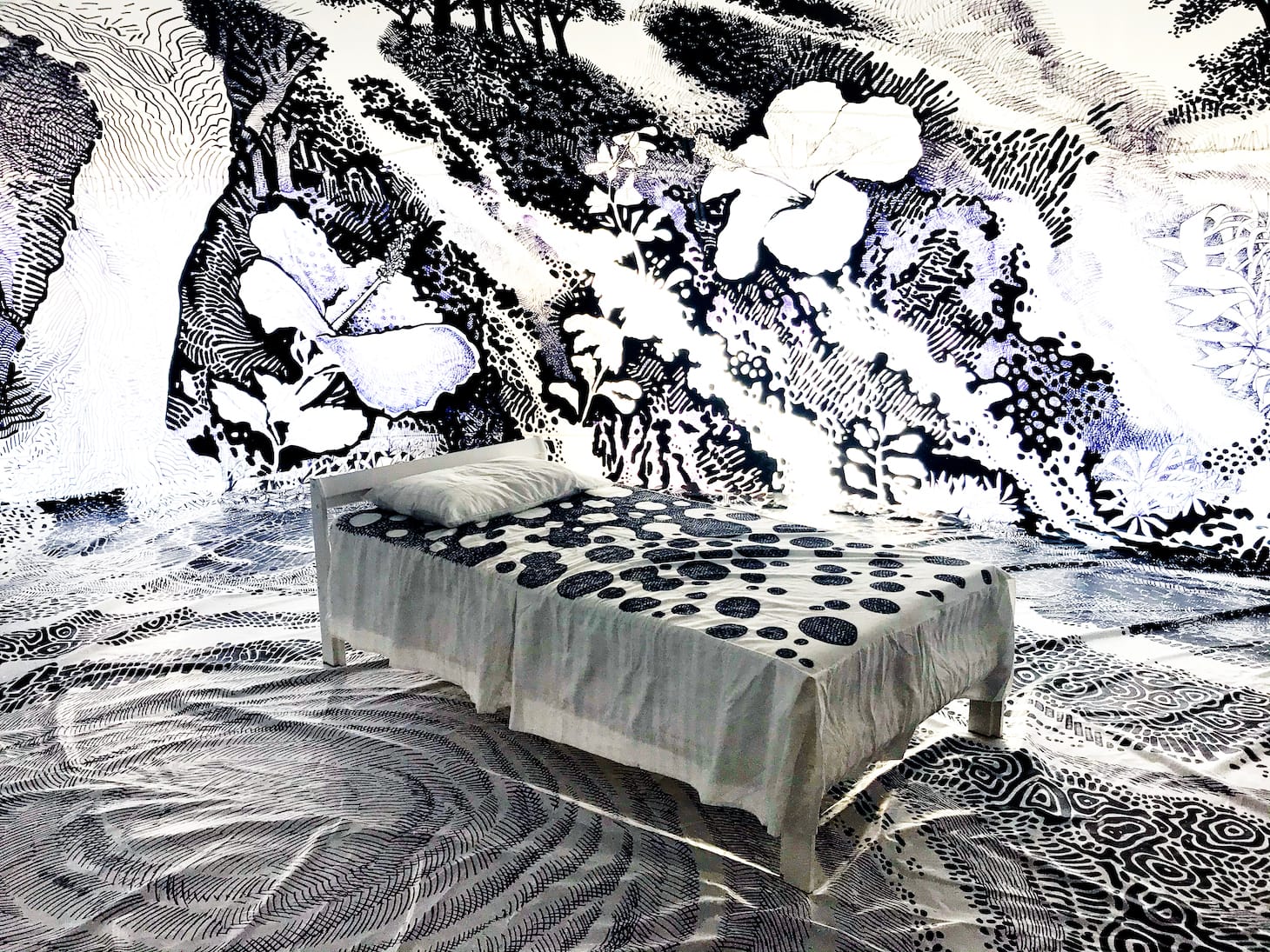 In Oscar Oiwa’s 360º installation, Dreams of a Sleeping World, rippling circles resemble hundreds of eyeballs, rabbits emerge from black voids, and plant life springs out of stippled marks.