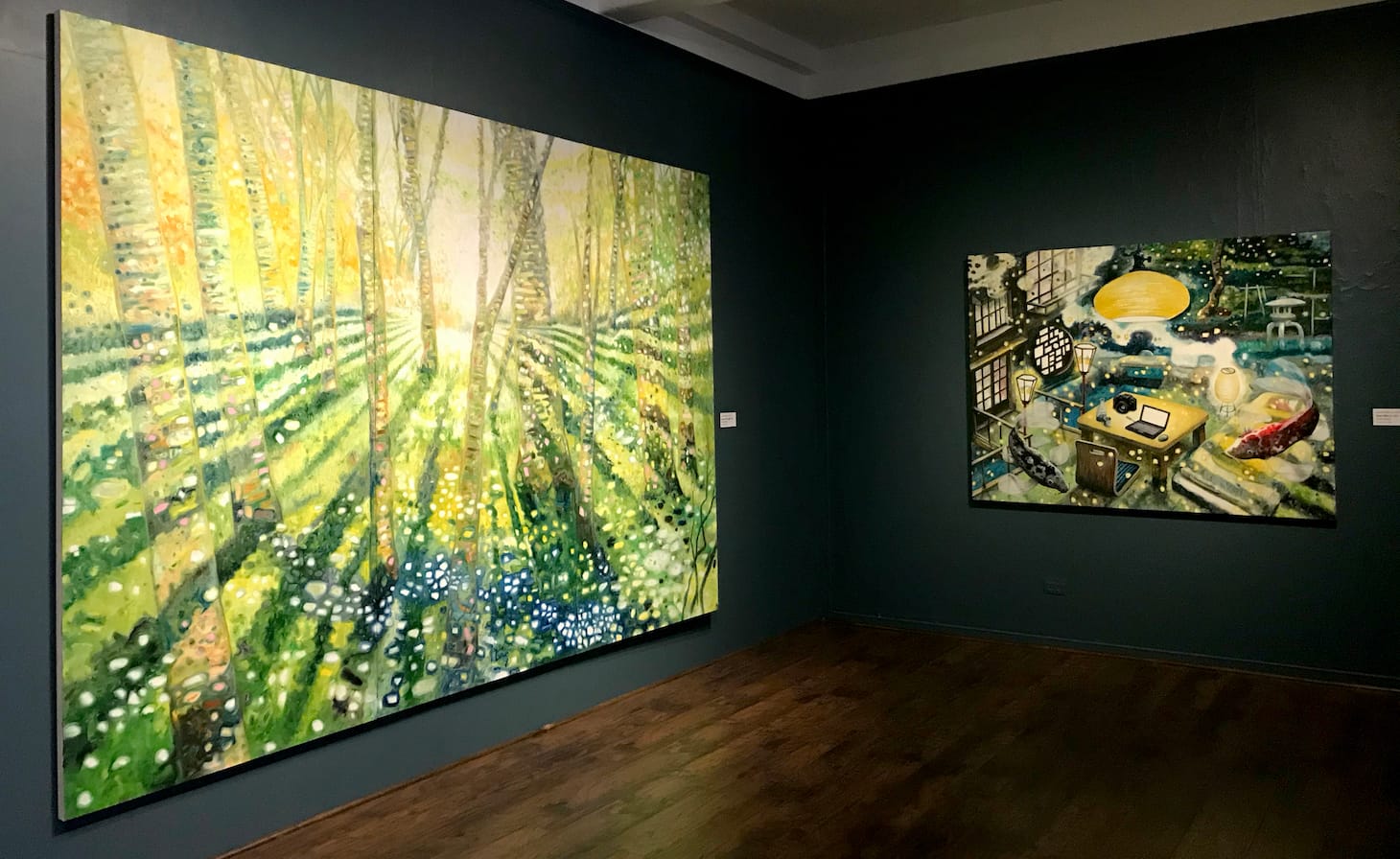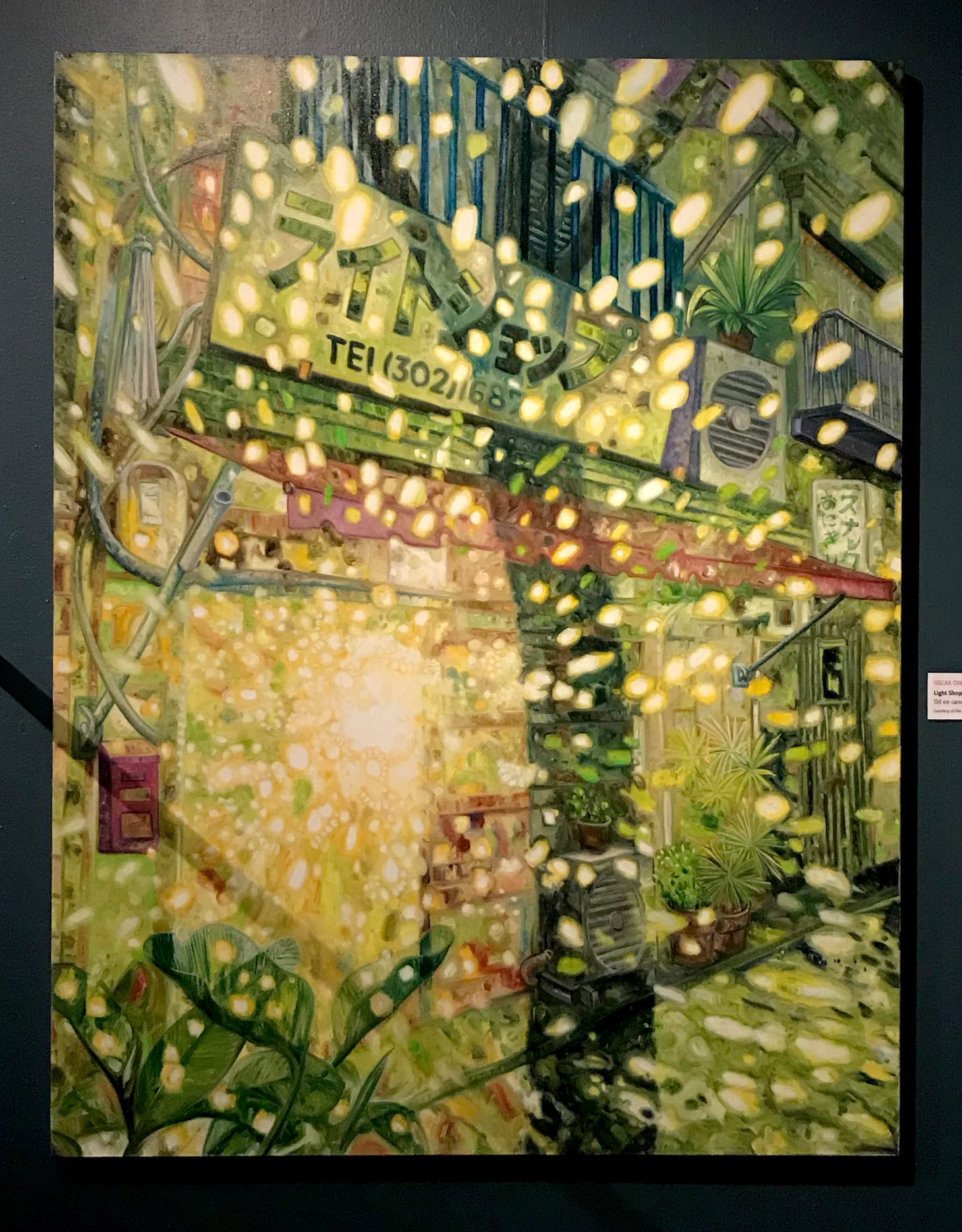 Before stepping into the showpiece, viewers get to see Oiwa through his paintings, which take on different degrees of fantasy. In “Light Shop,” a Japanese convenience store is partially hidden behind a burst of bright globules, a sight that is magical, but grounded. “Hotel Office 6” taps more into a dreamscape. It depicts a room in a traditional ryōkan, or Japanese inn, transformed into a zen garden. Tatami mats become makeshift bridges across koi ponds, but the fish swim above the futon and the low work table. Oiwa is not present, but an open laptop, a camera, and a bottle of sake suggest that he’s only stepped away for a moment.