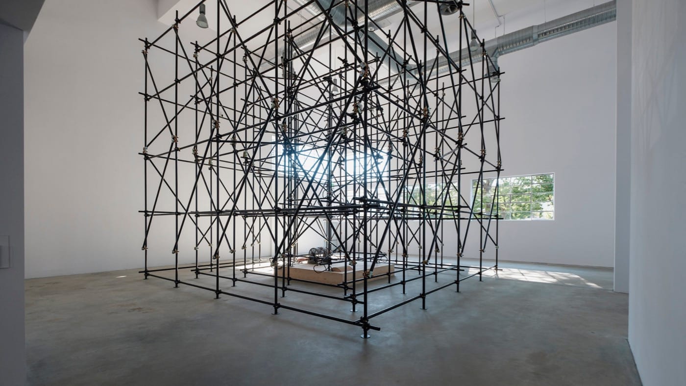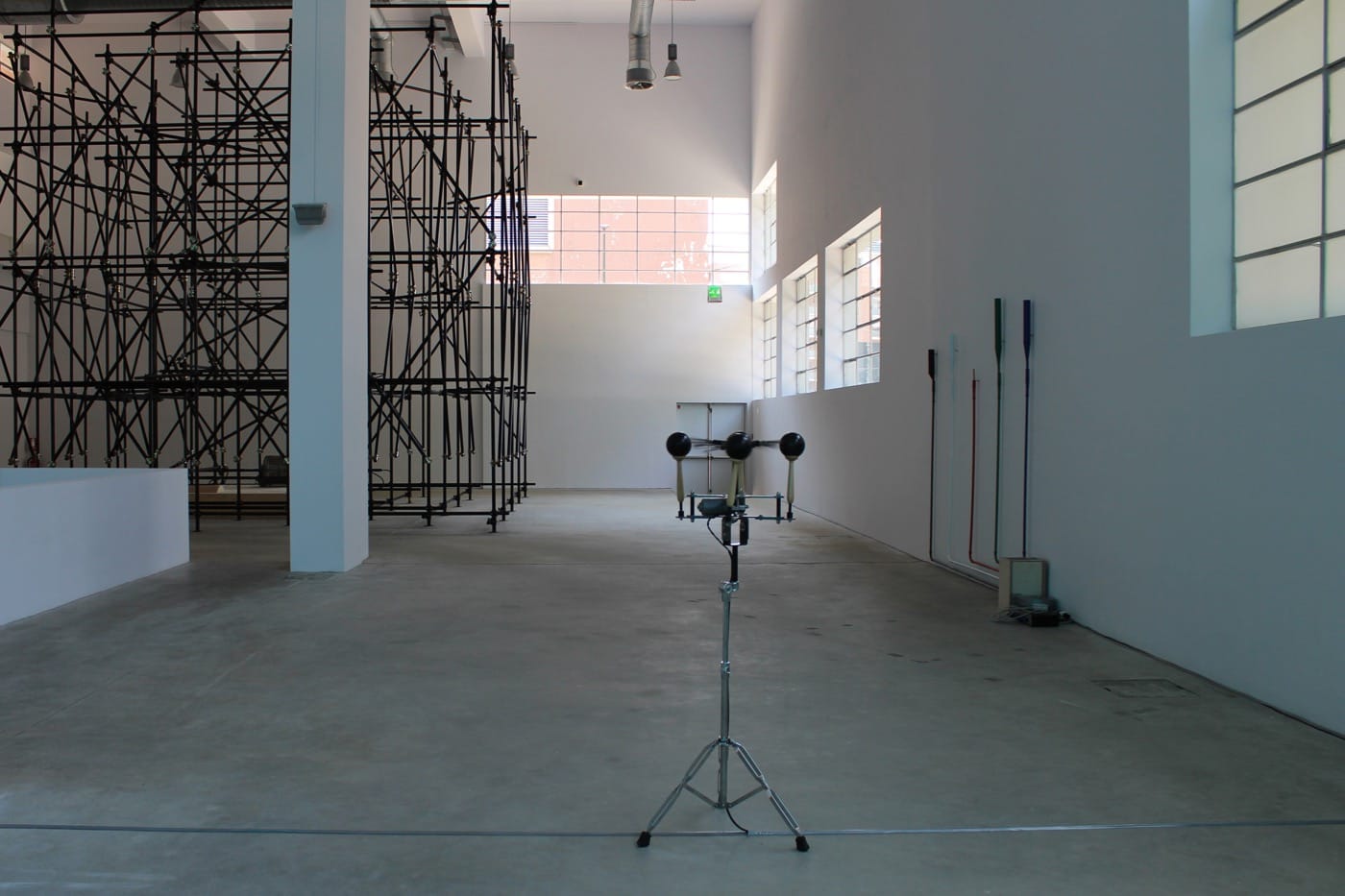 recreates this line through constructing a central source of music surrounded by a grid of black space: a huge web (or void) of black scaffolding. The musical mechanism is comprised of a rotating steel drum on top of a large plywood box (technically known as a wind chest) which pumps pressurized air through air vents in the scaffolding. The result? A functioning pipe organ. The sculpture produces a cavernous, resonating sound that reverberates throughout the gallery and grabs the gut. Although the exhibition doesn’t use wall texts, it is accompanied by a little booklet with titles, dimensions, and a short rationale for each piece, referencing Juarroz without sharing lines from the poem.