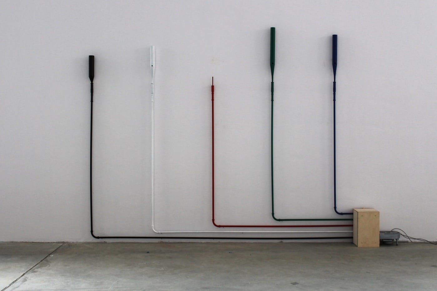 Likewise, “Voyelles” (2017) makes complex emotional connections between title, object, and concept. Firstly, the title is taken from Arthur Rimbaud’s visceral poem of the same name, in which vowels are assigned the colors black, white, red, green, and blue, according to their perceived origins. For example, Rimbaud wrote: “E, candeurs des vapeurs et des tentes, / Lances des glaciers fiers, rois blancs, frissons d’ombelles,” which means, “E, whiteness of vapors and of tents, / lances of proud glaciers, white kings, shivers of cow-parsley.” Each of the five, wall-mounted pipe organs take a color, and is meant to reproduce an individual vowel in the “Vox Humana,” a traditional reed stop in the instrument which is meant to resemble a human soloist.
