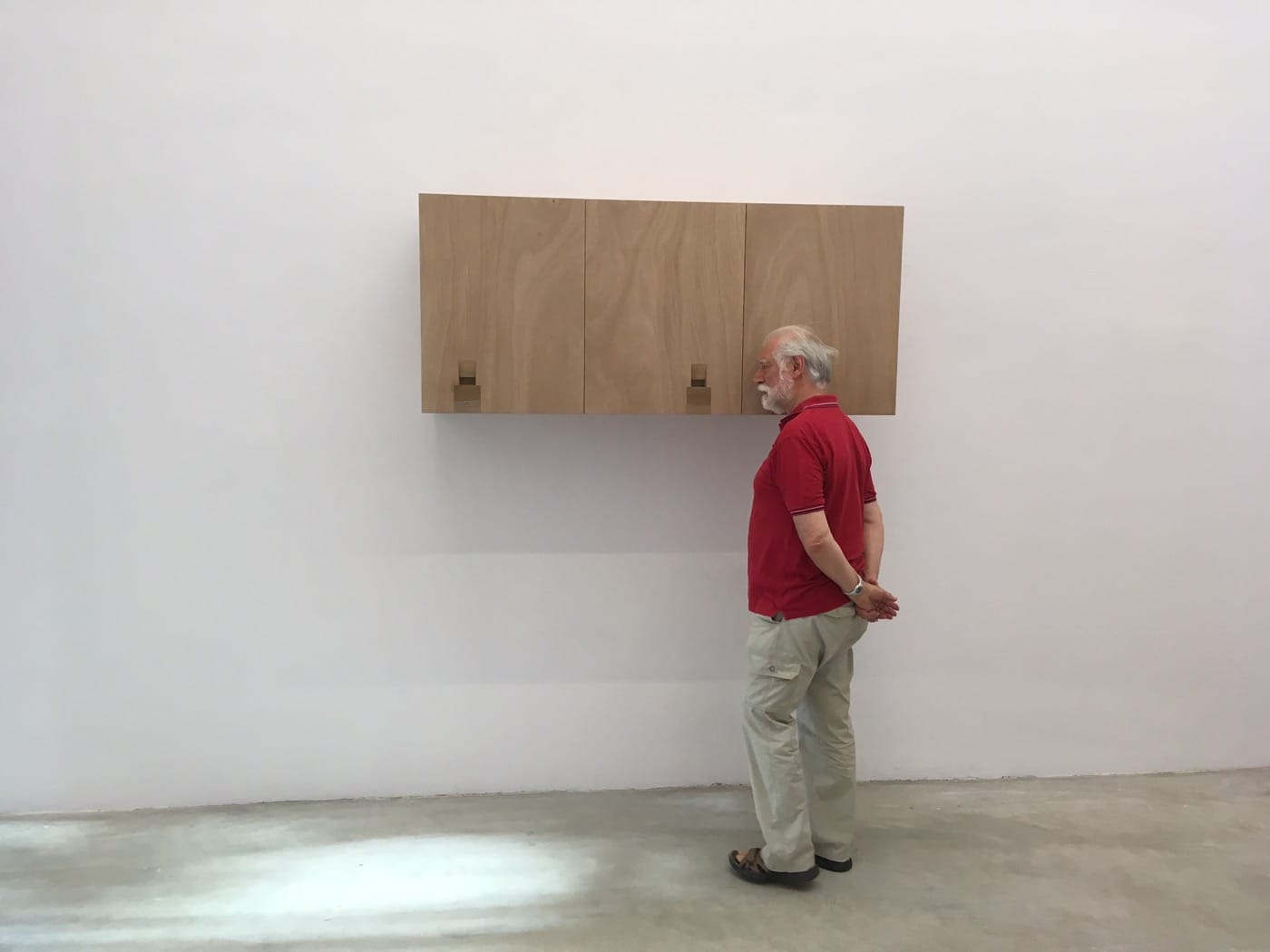 My favorite piece — I return again and again to listen — deviates from the theme somewhat by not alluding to Reich’s “Four Organs”, but rather to one of his influences. “Three Quarter-Tone Pieces” (2009) is named after Charles Ives’s 1924 composition for two pianos, in which one is tuned one quarter of a tone higher than the other. It’s revealing to note that Reich stated in a 2002 interview that he found Ives’s music to be “heartbreakingly beautiful.” I would agree; this piece, however, is also aims to disorient, using an unexpected pitch. Bartolini’s artwork creates a suitably uncomfortable sensory effect which echoes the other-worldly feeling of the original piano piece. It is, at times, unbearable: a sickening drone that implies the imagined sounds of a deep-sea monster, or the throttling of alien spacecrafts as depicted in movies. “Three Quarter-Tone Pieces” is perversely pleasurable, leaving me with the beginnings of a headache yet unable to tear myself away. Its construction is also worth noting, as it really is at odds with this overwhelmingly monstrous noise — resembling a set of plywood furniture from IKEA punctured with subtle vents. It is even described in the catalogue as “a wardrobe, a trunk and a kitchen cabinet.” Perhaps this suggestion of domesticity is a tool with which to lull the viewer into a false state of security; coaxing us closer to the source of the sound, before releasing a series of nightmarish, low hums.