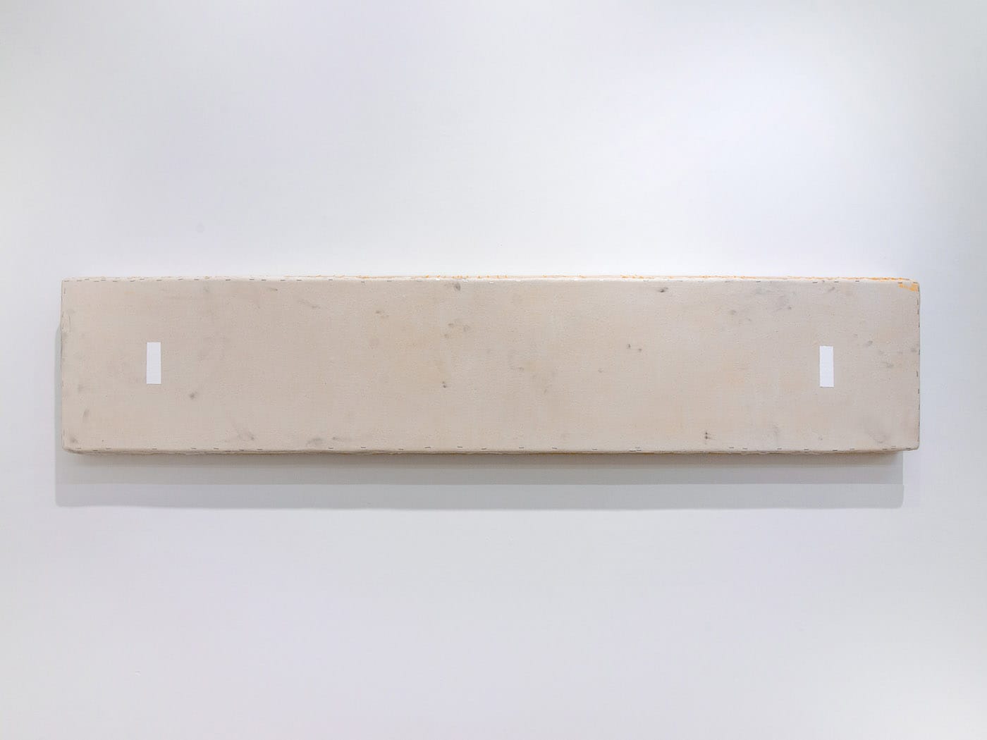 In “Natural with Two White Rectangles Far Apart” (2018), he locates two vertical bars on the far ends of a painting that measures 17 ½ inches high by 85 ½ inches wide. The tonal shift from the off-white ground to the white rectangles makes you conscious of the widening field of your attention.