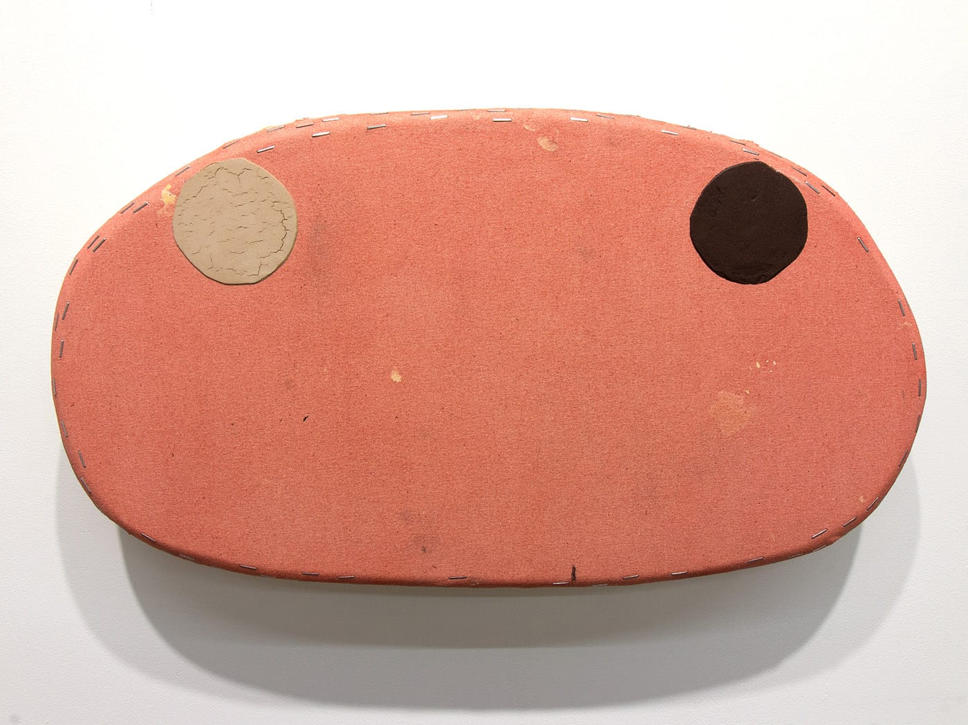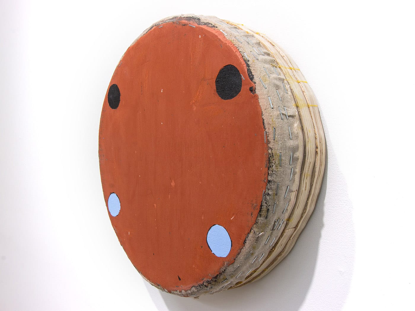 The stacks can be round and irregular, square with rounded edges, horizontal and narrow (panoramic), or elliptical. Some of the circular forms look like someone gave them a gentle squeeze. The stacked supports stick out from the wall as much as three or four inches. Jones attaches a section of cut canvas to the stack’s surface, often using an excessive number of staples.