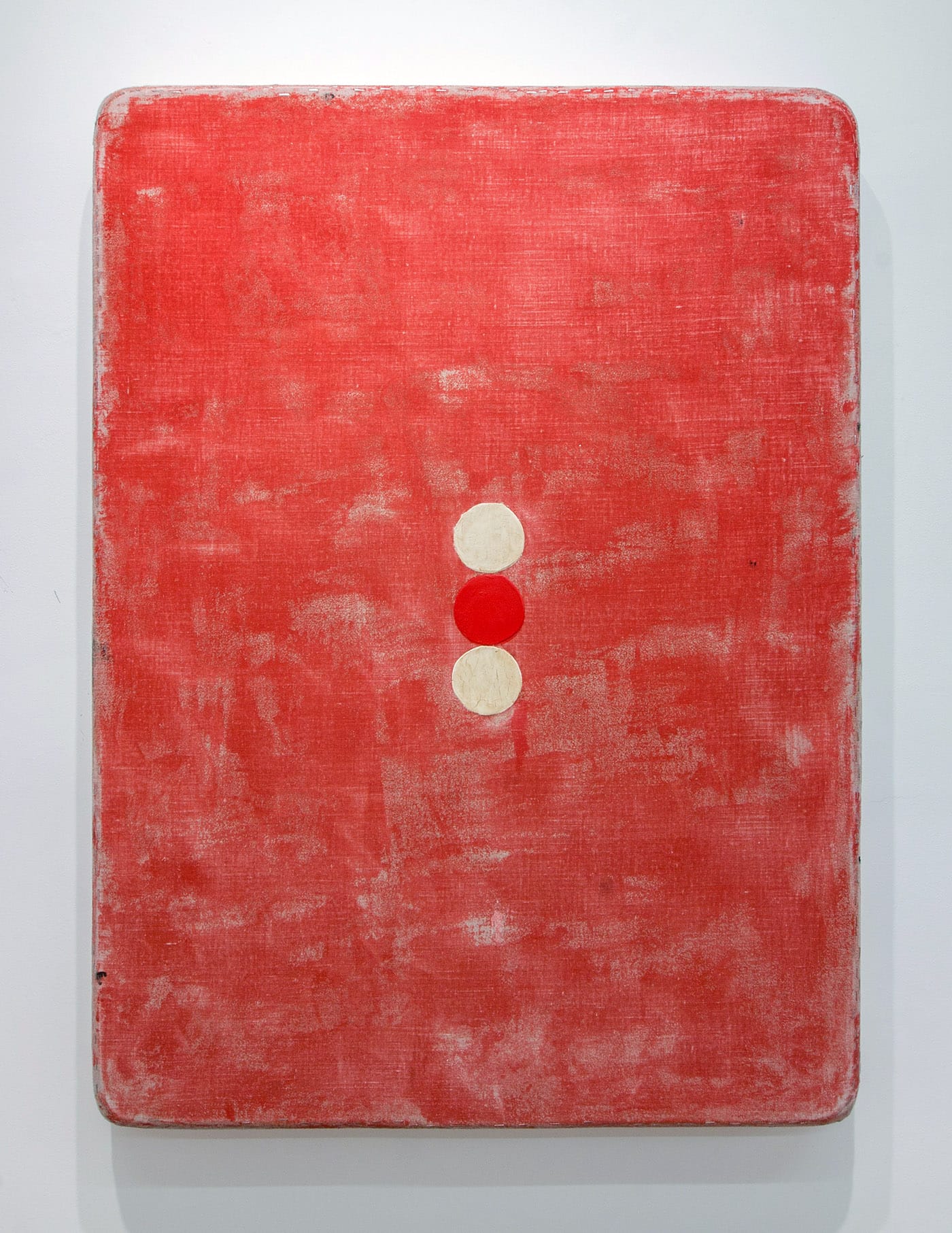 I would claim that this is one of the underlying effects of Jones’ work. In contrast to the pure opticality that Stella and others who were associated with Minimalism tried to attain, Jones wants to make you aware of your experience, particularly along the spectrum running from the optical to the visceral. In the irregular circular painting, “Red with Two Black and Two Blue Circles” (2018), the placement of the black and blue circles along the painting’s circumference makes you conscious of the empty field between them.
