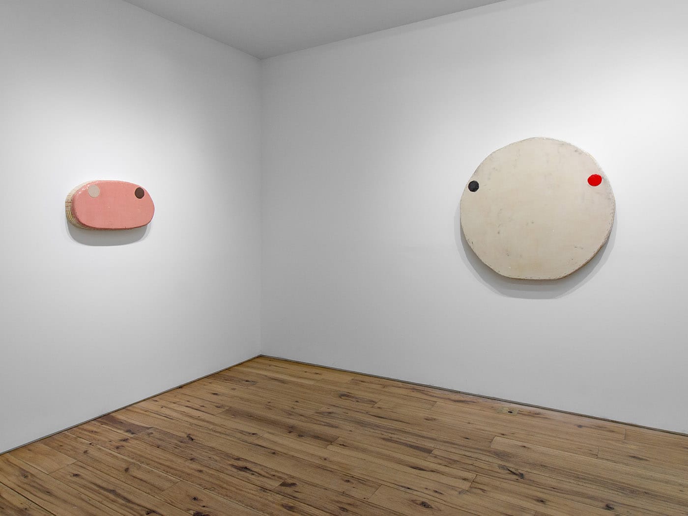 Jones seems to have been inspired by Jasper Johns’s dictum: “Take an object. Do something to it. Do something else to it.” The object that Jones takes and does a number of things to is the monochrome painting – a classic Minimalist form – placed against the wall. Strictly speaking, Jones’s paintings are made from a stack of irregularly cut sections of plywood — or “pancake stack” — that he has glued together.