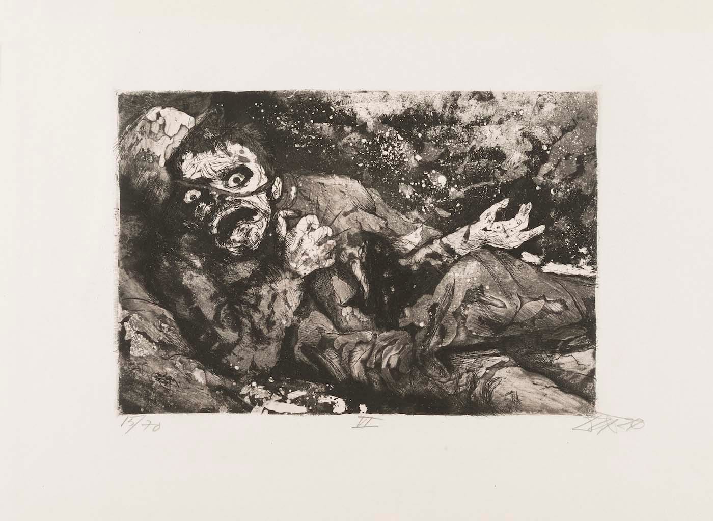 Representing the moment of impact on the battlefield, “Wounded Man (Autumn 1916, Bapaume)” is an index of physical pain. A soldier collapses diagonally across the picture plane, dissolving into a gray textured surface punctuated by stark patches of black and white, with sprays of acid spots surrounding the figure. The man’s gaping mouth and crooked, bug-eyed stare reduces any potential battlefield narrative into a moment of panic.