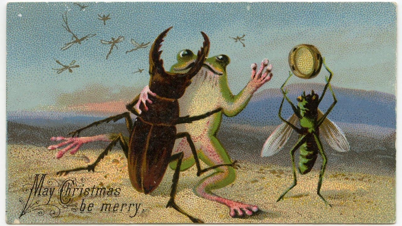Anthropomorphic cats, murderous frogs, and insects dancing by the moonlight aren't exactly part of our Christmas card tradition today.