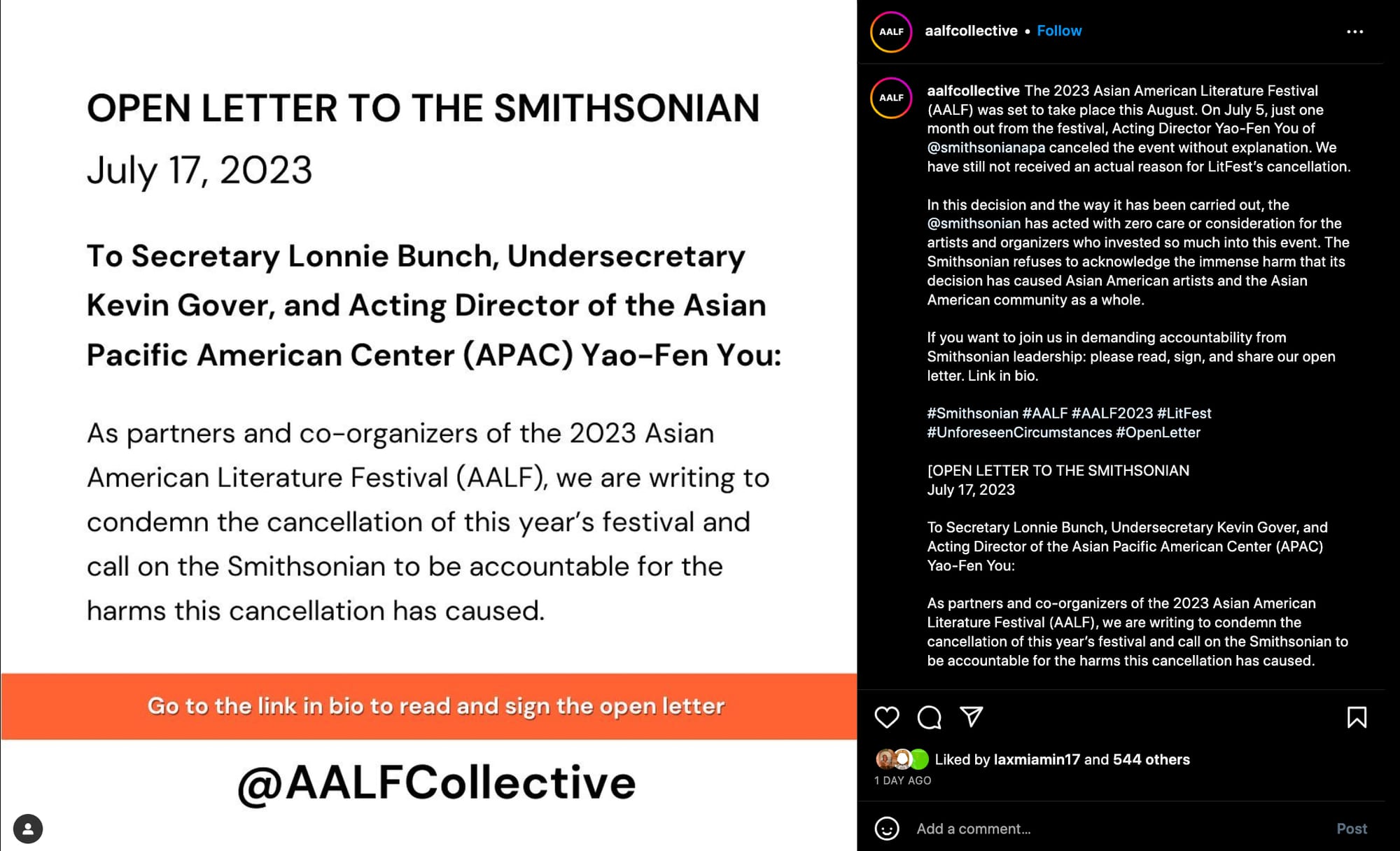 More than 1,100 scholars, poets, writers, and supporters have signed an open letter outlining concerns and demands directed at the Smithsonian Institution after the abrupt cancelation of the 2023 Asian American Literature Festival (AALF). The letter, written by AALF partners and participants, alleges that the Smithsonian's Asian Pacific American Center's (APAC) notice of the event's cancellation just one month before it was set to take place shows "a flagrant lack of accountability for the harm caused" to both APAC staff and festival participants.