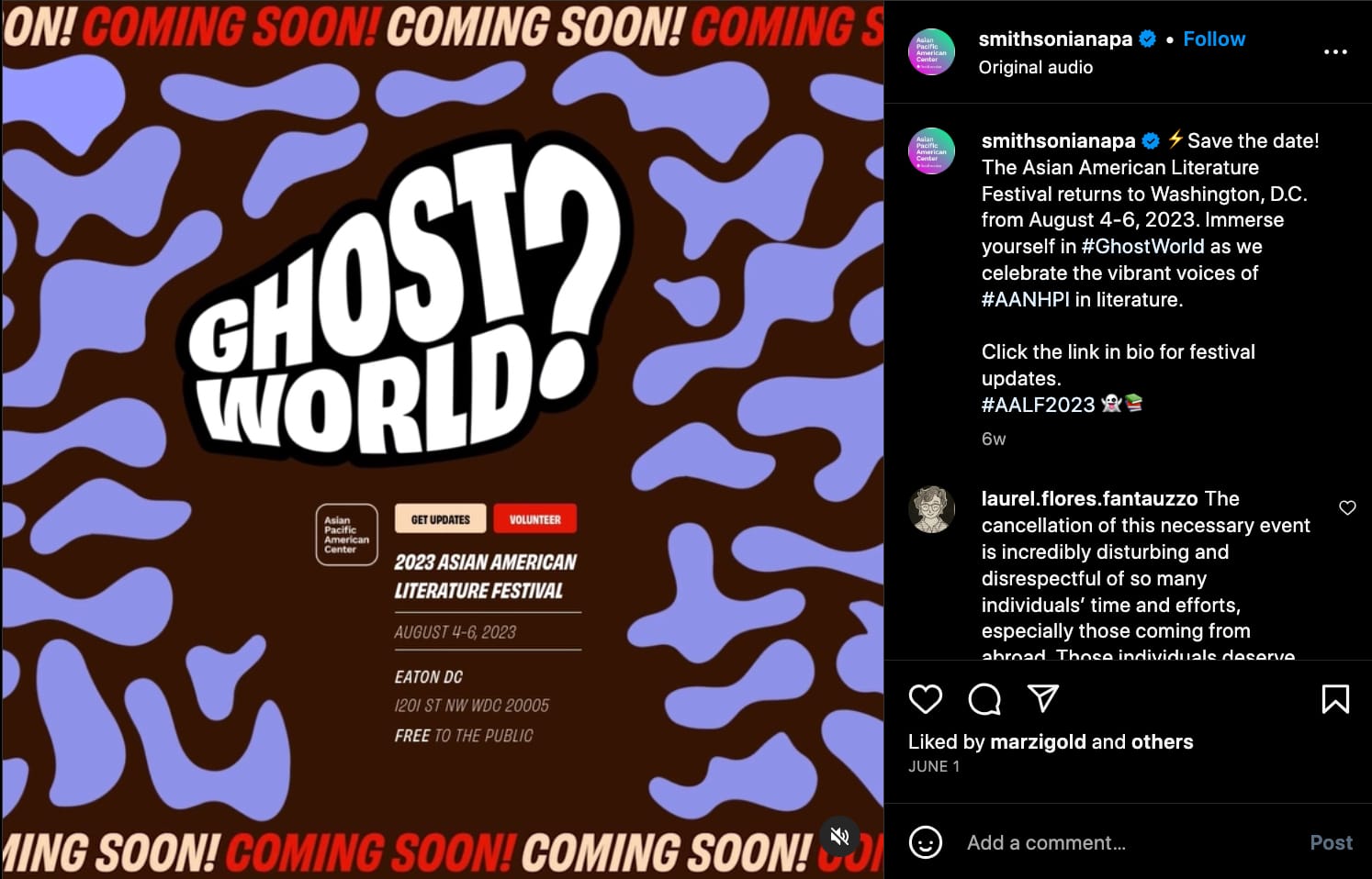 The letter also calls for the Smithsonian Institution to host the Reading Room as a standalone event later this year. Other demands include promises of a 2024 iteration of AALF, more transparent and collaborative decision-making processes for the festival moving forward, and full honoraria and paid accommodations at the hotel venue for all participants who aren't able to cancel their travel plans.