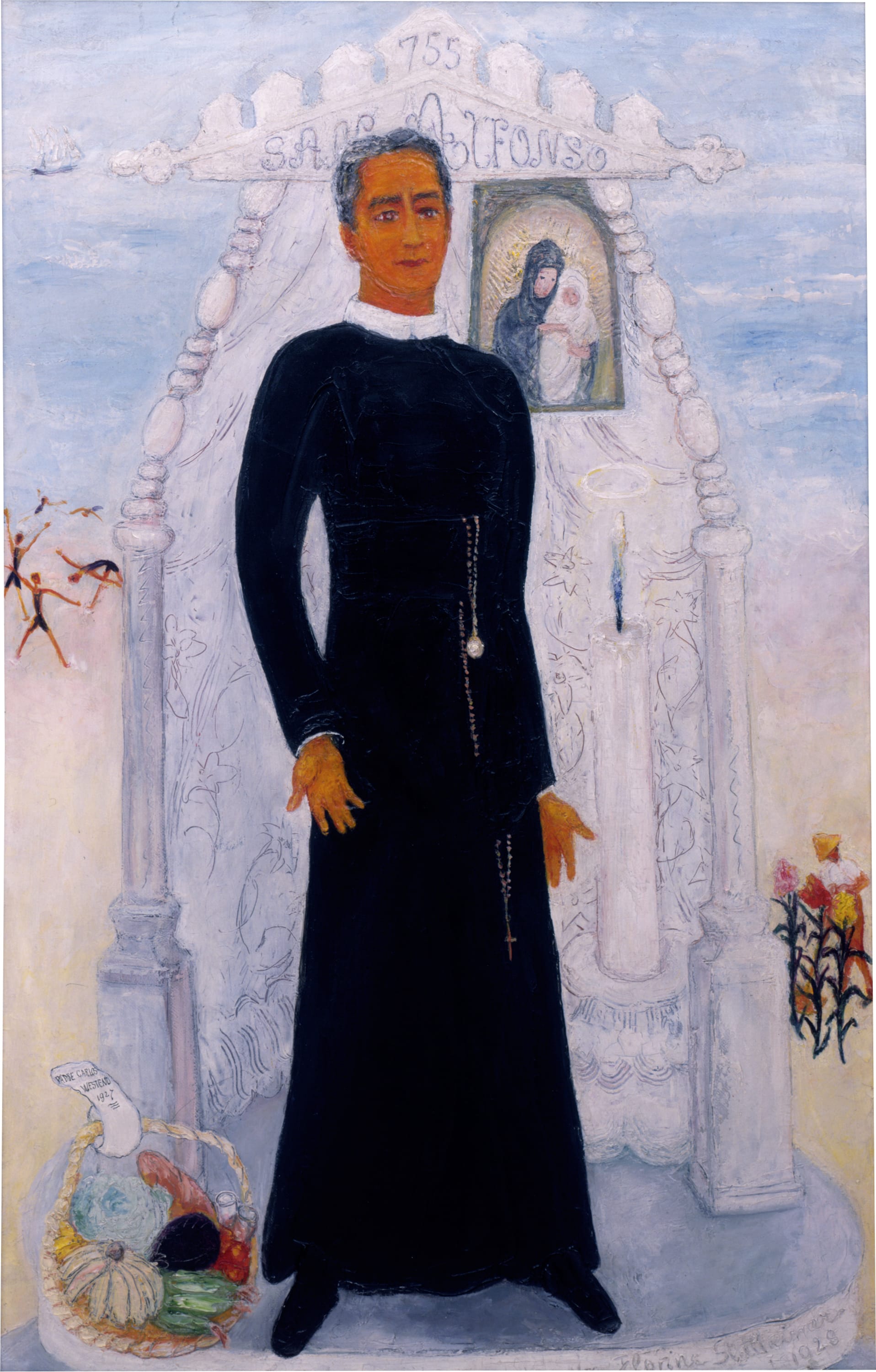For the trained artists featured in the show, their unschooled counterparts exerted an irresistible pull as exemplars of vitality, ingenuity, sincerity, and a bracing lack of polish. Among the moderns, avid collectors of folk or “primitive” art such as Elie Nadelman and Yasuo Kuniyoshi created works that were indebted to the untutored artists they cherished; Louis Eilshemius and Florine Stettheimer renounced their formal training and embraced a naive idiom, though to a mixed reception (Stettheimer was devastated by the response to her lone gallery exhibition during her lifetime). Marsden Hartley’s admiration for the folk paintings he encountered in the American Southwest comes across in portraits that pay homage to their style, but the unvarnished directness and formal flatness of these late-career works also reflect artists he may not have been aware of, such as Horace Pippin and the immigrant John Kane, born in Scotland to Irish parents. The latter’s bare-chested self-portrait greets the viewer with arresting assurance and verve.