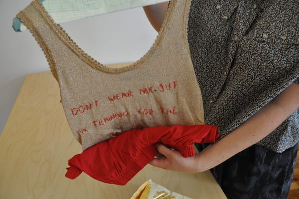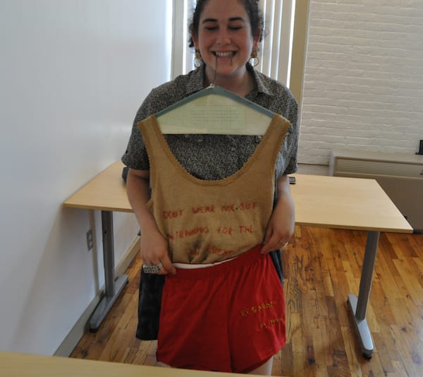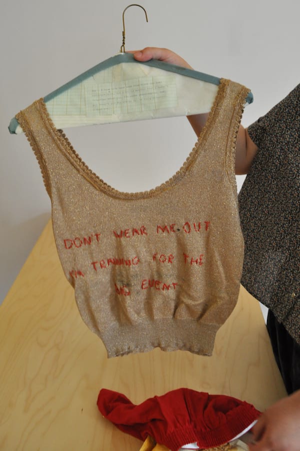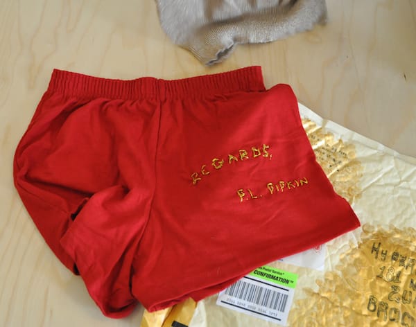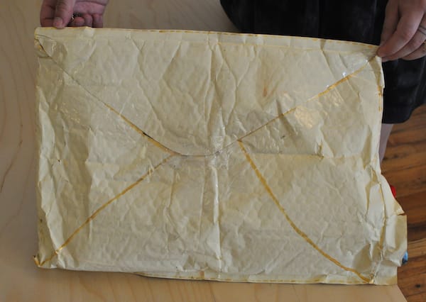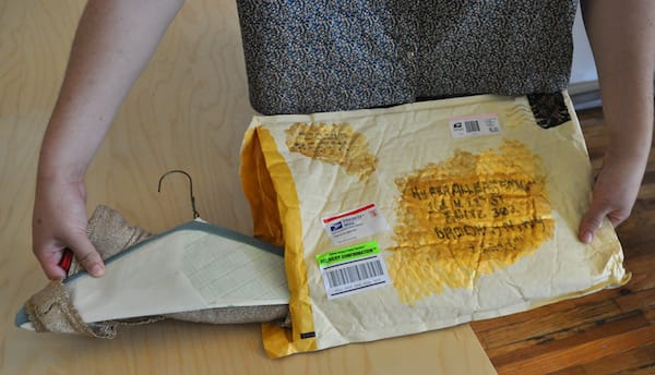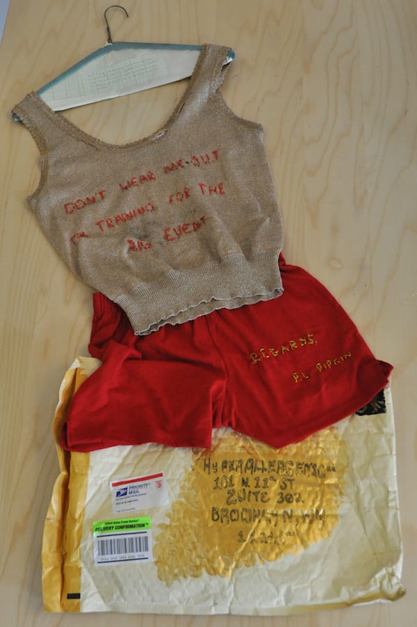 Peri Lee Pipkin of Oakland, California (is this him?) mailed us a whole ensemble, complete with hanger. I’m not sure if we’re supposed to wear this to the opening of Presents (I’m tempted), but I was reminded how much of what we get via snail mail is no longer letters but packages of merchandise from online sellers.