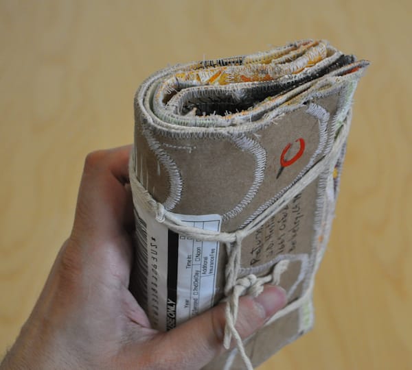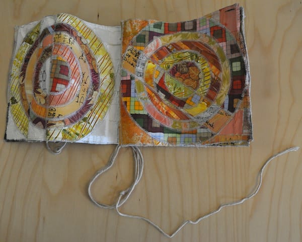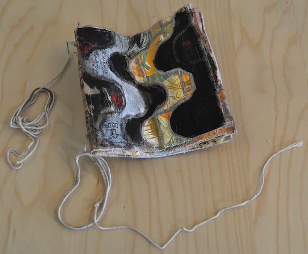 Twitter pal J.D. Hastings of Berkeley, California, has sent us a beatifully sewn book of painted canvas, magazine pages and textiles. Created like a patchwork quilt, the object arrived tightly bound into a bundle that looked like something from a bygone era. Each page is filled with a target that reaches the edges of the page and a single strip shoots through the form.