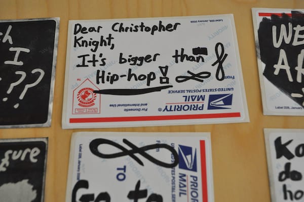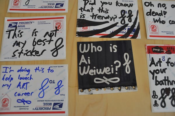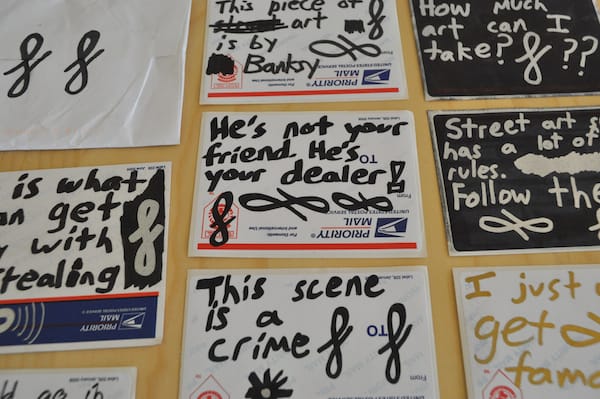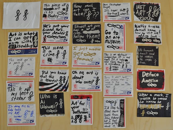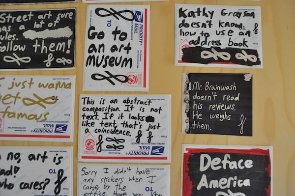 I have been pretty disappointed that more street artists haven’t taken up our challenge to create mail art for the upcoming exhibition, but I was very happy Curly joined the fray with his clever stickers, mostly written on postal address labels. His work is often spotted on street around the world, including New York and London. One of the things that differentiates his work from most street artists is his obvious awareness of the greater art world. It is sometimes philosophical — “This scene is a crime” or “This is an abstract composition. It is not text. If it looks like text, that’s just a coincidence.” — often timely and critical — “Who is Ai Weiwei?” and “Dear Christopher Knight, It’s bigger than Hip-hop!” — and usually pretty darn funny — “I’m doing this to help launch my ART career” and perhaps my favorite, “Mr. Brainwash doesn’t read his reviews. He weighs them.” All of his folksy stickers are signed with his signature flourish and, like all good street art, they reflect on the world around them but also engage in a secret dialogue with those who seek out urban hieroglyphics. As an aside, Curly’s tweets are pretty funny.