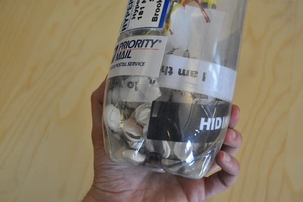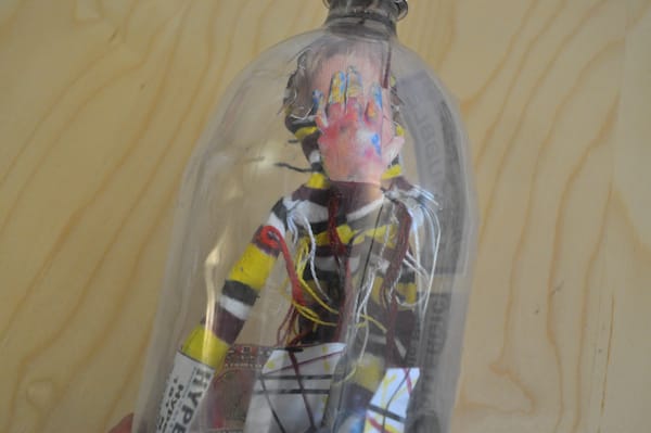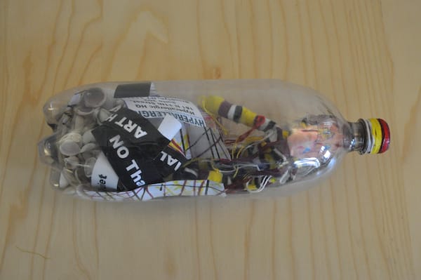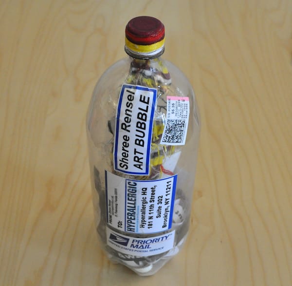 Finally, Sheree Rensel mailed us an authentic bottle filled with Floridian sand and shells. A voodoo doll-like form with a photograph sewn on it that shows a person covering their face with her hand (I’m guessing it’s the artist judging by her Twitter icon). The fabric-bodied figure hangs from the bottle cap, which is sealed with wax and string. All around her feet are slips of paper covered with messages like “Don’t Look” and “Art Here.” It evokes a kitschy tourist souvenir, but here the figure seems impossibly trapped in the container, like a ship in a bottle. Has she sent her avatar in lieu of her attendance?