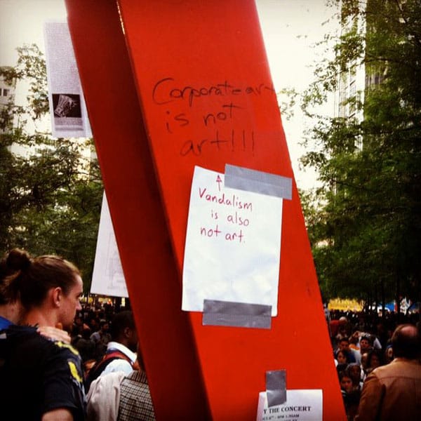 We’ve already mentioned that the Occupy Wall Street Journal labeled Mark di Suvero’s massive public sculpture as a “weird red thing,” which we read as “ugly” — and most of you (65%) disagreed with that assessment. But now a small spat on on the sculpture itself raises some some big questions we regularly address on Hyperallergic.