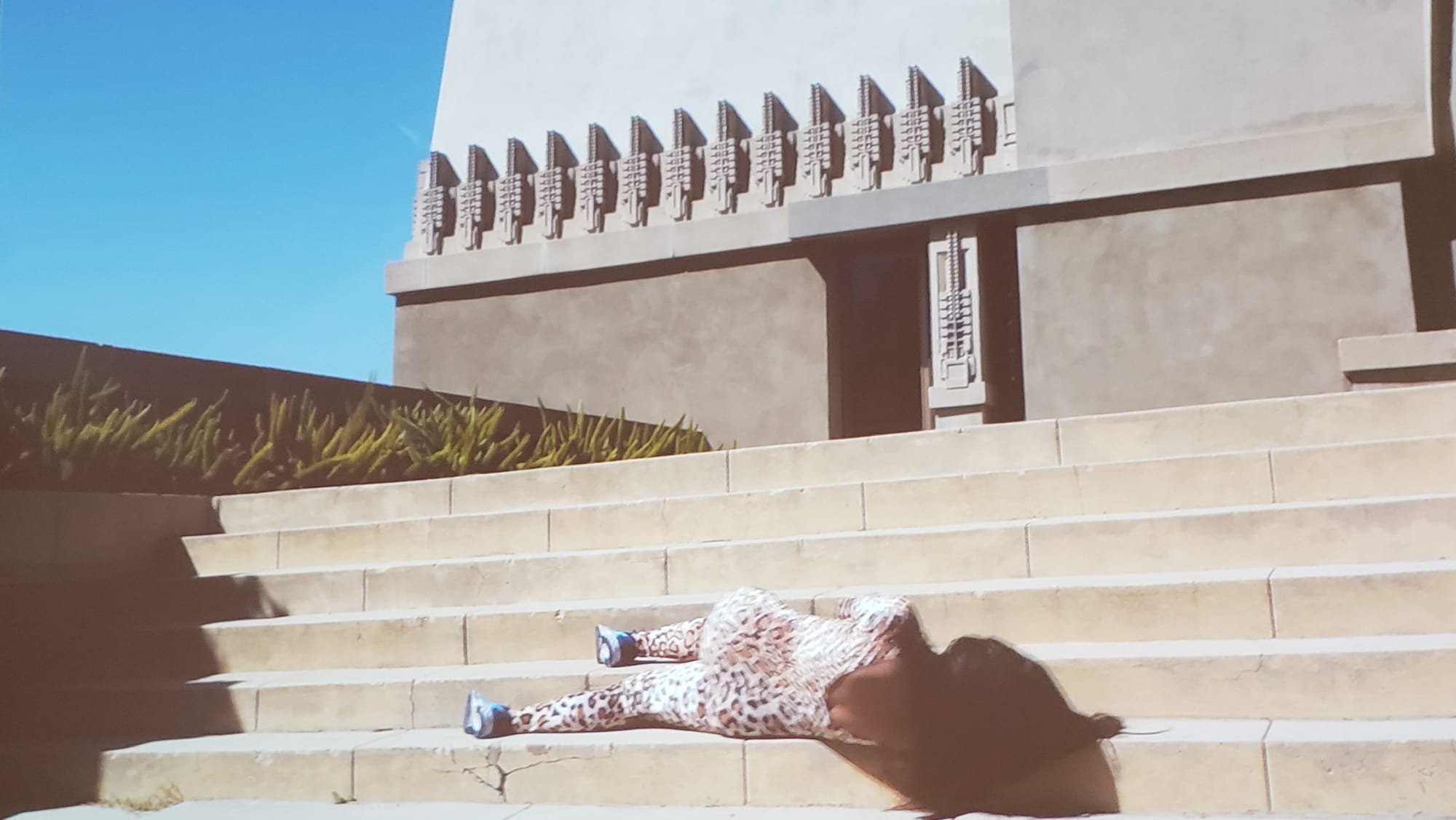 The show is visually stunning. Clarissa Tossin’s 17-minute video “Chu’u Maya (Maya Blue)” from 2017 arrests the viewer with footage of performance artist Crystal Sepúlveda dancing around the exterior of Frank Lloyd Wright’s Mayan Revival-style Hollyhock House, as a mesmerizing, rhythmic musical track of flutes, drums, and beating hearts set the tempo. Sepúlveda’s performance blurs the boundaries between body and structure, mobility and stasis, as her billowing robes and bodily movements cast shadows on the building’s façade and courtyard, transforming the structure from a backdrop into a participant. Her movements are painstakingly choreographed to mimic the gestures found in classic Maya vase painting, stone carvings, and murals. In one scene, she throws her body down the stairs, visually quoting an iconic image of a dead captive from the eighth-century murals at the Maya site of Bonampak, connoting themes of self-sacrifice and transcendence.