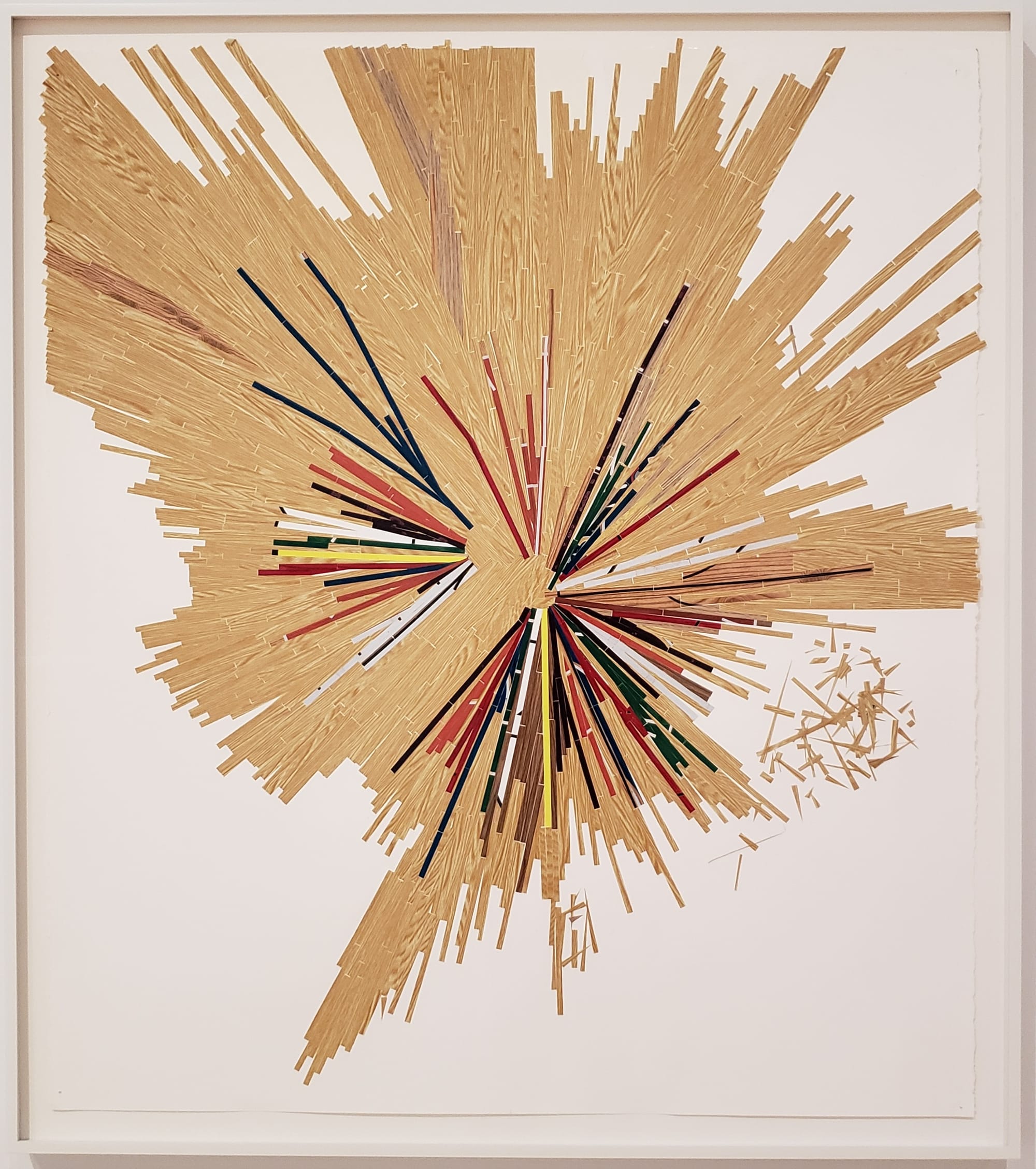 Immediately following Tossin’s video is the work of Ronny Quevedo. Referencing both Andean and Mesoamerican cultures, his mixed-media pieces simultaneously evoke soccer fields, gymnasium floors, and the Mesoamerican ballgame. “Quipu” (2017), a screenprint made from printed adhesive vinyl and enamel on paper, references the ancient Andean mnemonic record-keeping devices made from knotted strings. Here, the splintered fragments of vinyl and the errant multicolored lines that break away from the central image suggest fractured histories and temporal discontinuity, wrought by legacies of colonialism.