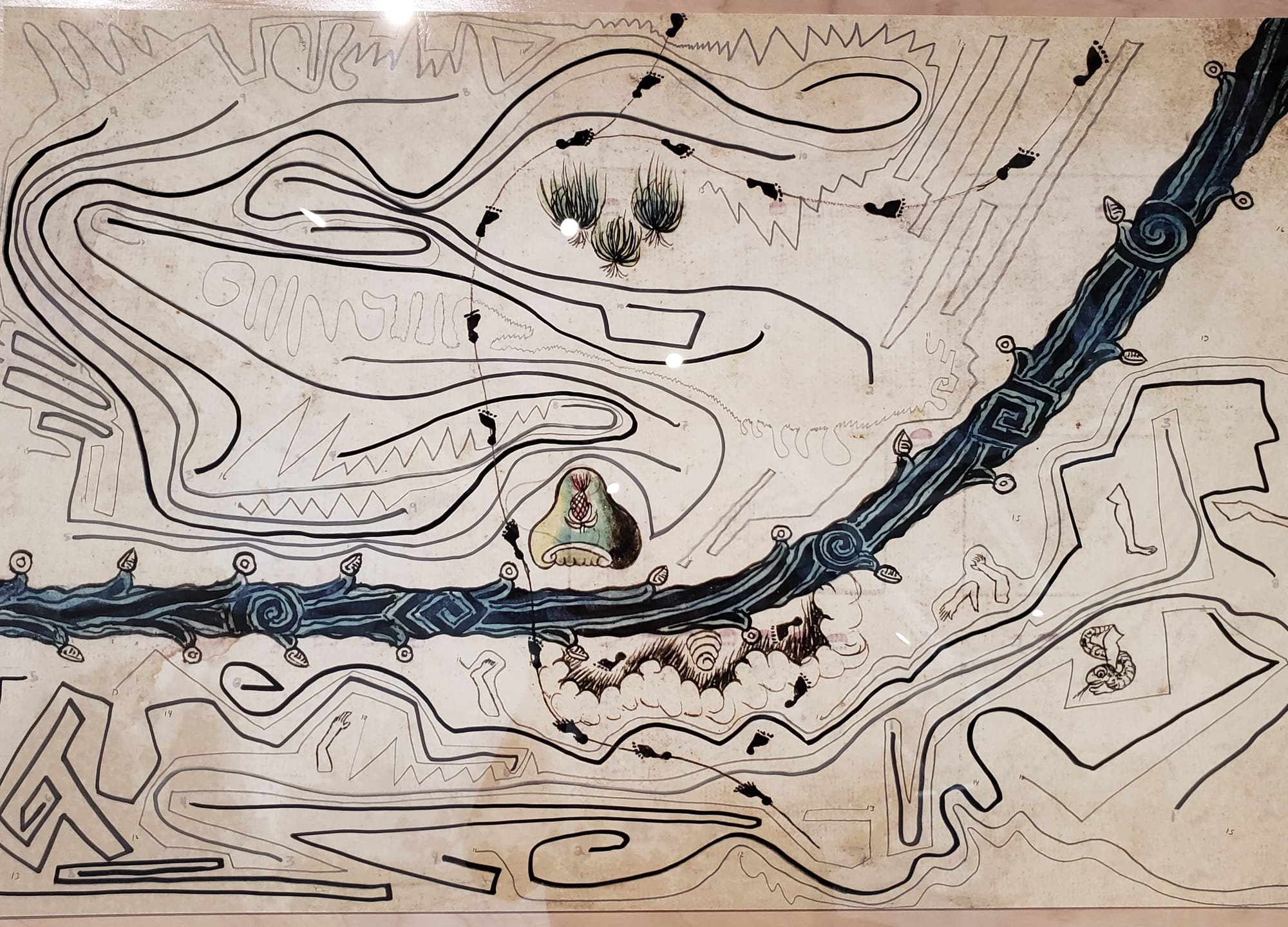 The collaborative aspect involves a Salvadoran game called Tripa Chuca, in which participants connect pairs of matching numbers distributed across the page without crossing over any of the previously drawn lines. The result is a series of bold contour drawings that exhibit a surprising visual harmony with the Nahua pictorial elements. The maps, in their frenetic, jagged lines, superimposed over footprints, place glyphs, and treacherous swirls of fast-moving water, suggest the perilous journeys of the undocumented, particularly in the aftermath of Prevention Through Deterrence in the 1990s, which weaponized the natural landscape against migrants, leading to an untold numbers of deaths.