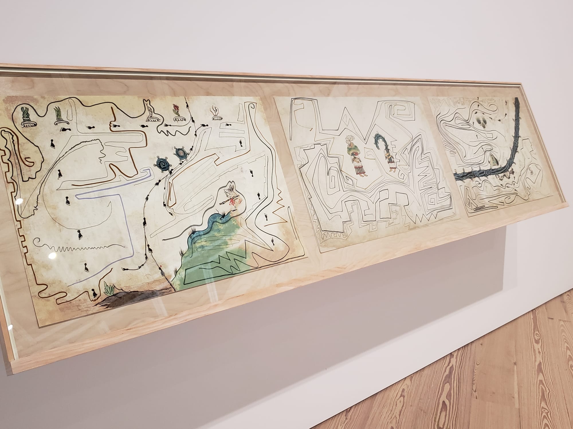 Maravilla’s choice of manuscripts is particularly relevant: the Historia Tolteca-Chichimeca is also a manuscript about migration; it tells the story of the Tolteca-Chichimeca’s exodus from their homeland of Tollan before founding the altepetl (city-state) of Cuauhtinchan, which was subsequently usurped by the Aztecs in the 15th century. The manuscript itself was produced decades after the conquest, when the people of Cuauhtinchan were once again displaced, this time under Spanish colonial rule. It is poignant that the Historia Tolteca-Chichimeca was never finished. As art historian Dana Leibsohn notes, “ it is difficult to assess whether the annalists concluded the work, or whether they anticipated a continuation that a shortage of energy, resources, or perhaps unforeseen circumstances prevented. Clearly the clock ran out.” Maravilla’s remixed, re-contextualized maps reset the clock and continue the narrative, reminding the viewer that the story of hemispheric migration and displacement stretches back for millennia, and that colonialism is an ongoing project that exists in new permutations in the 21st century.
