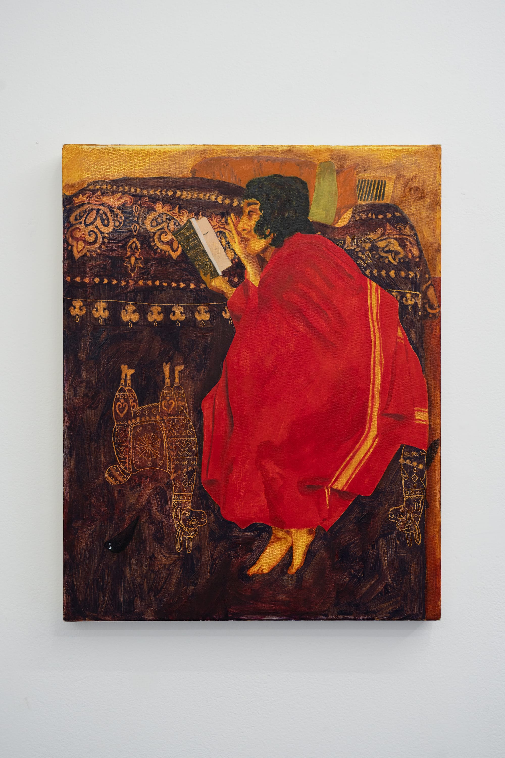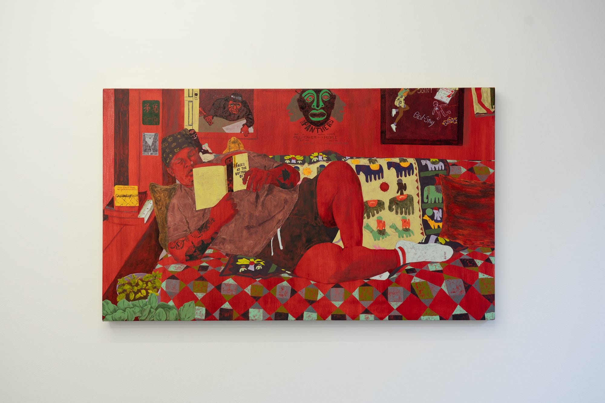 The book reminded me of the arguments against and bans on teaching critical race theory throughout the United States. What dissenters are really against is the teaching of American history that holds everyone accountable — including those who wrote the dominant historical narratives. On the brown bedspread is an embroidered llama, an animal native to Peru, seen upside down, its form echoing in reverse that of the reading woman, whose body partially covers another llama. The palette of red and different hues of brown, in contrast with a pale green bird, suggests a world ruled by color. This sense is reinforced by the two oil paintings flanking “Untitled.”