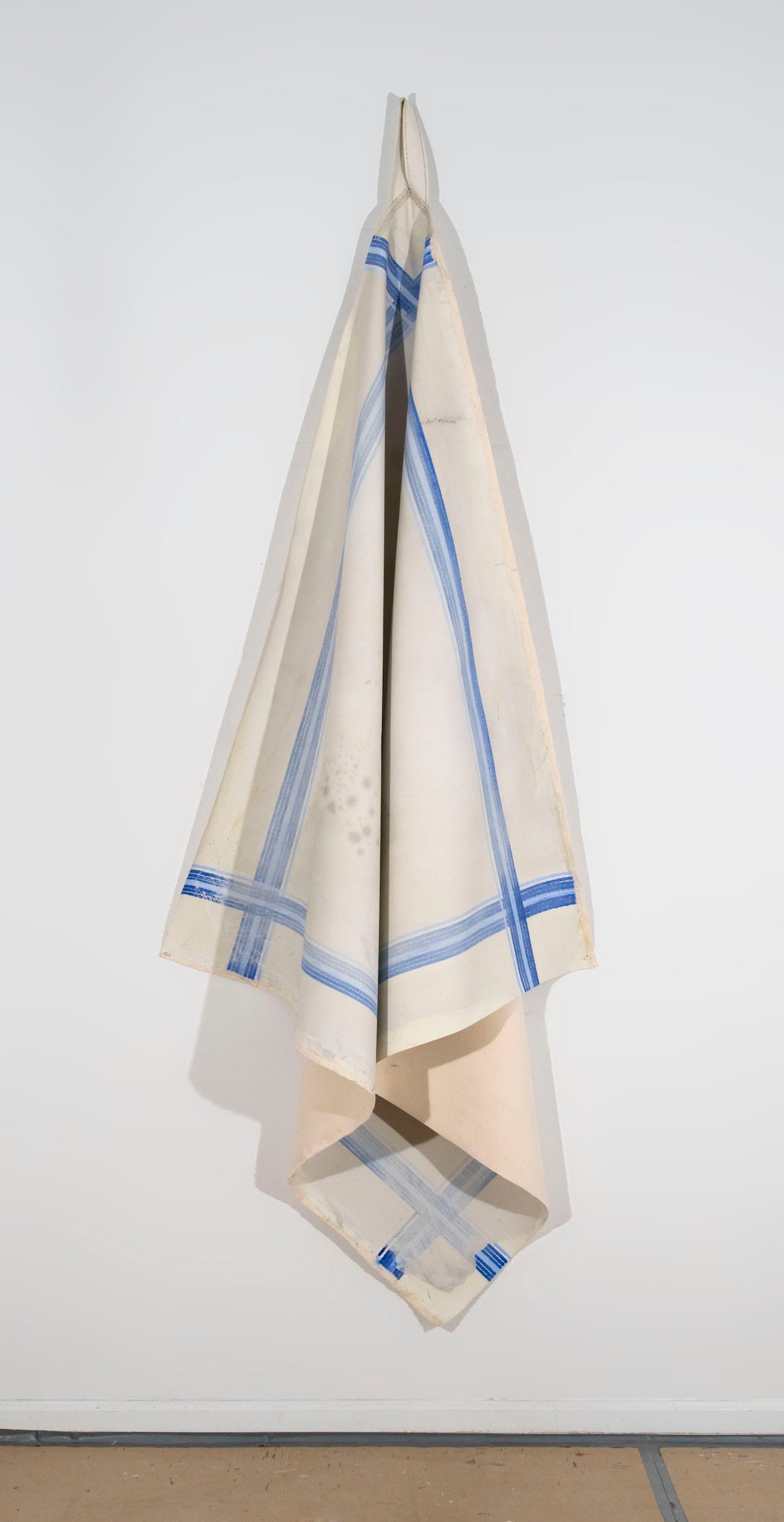 Up close, they are noticeably dirty, smudged, and frayed. Dirt is listed as a component of the work along with oil paint. It is in smudges and stains as well as in broad, painted swaths often ending unevenly at the border: the slightly darker, off-white, shadowy tone melds and toys with the actual shadows from the folds on the cloth. With their painted dirt, the unframed “Letters” reach beyond the personal or anecdotal (the morning coffee stain or spill over dinner with friends), as they locate art as dirty, quotidian, and stitched up with everyday life. These are not the clean, impersonal, separate, and pristine objects of the modern art gallery or museum.