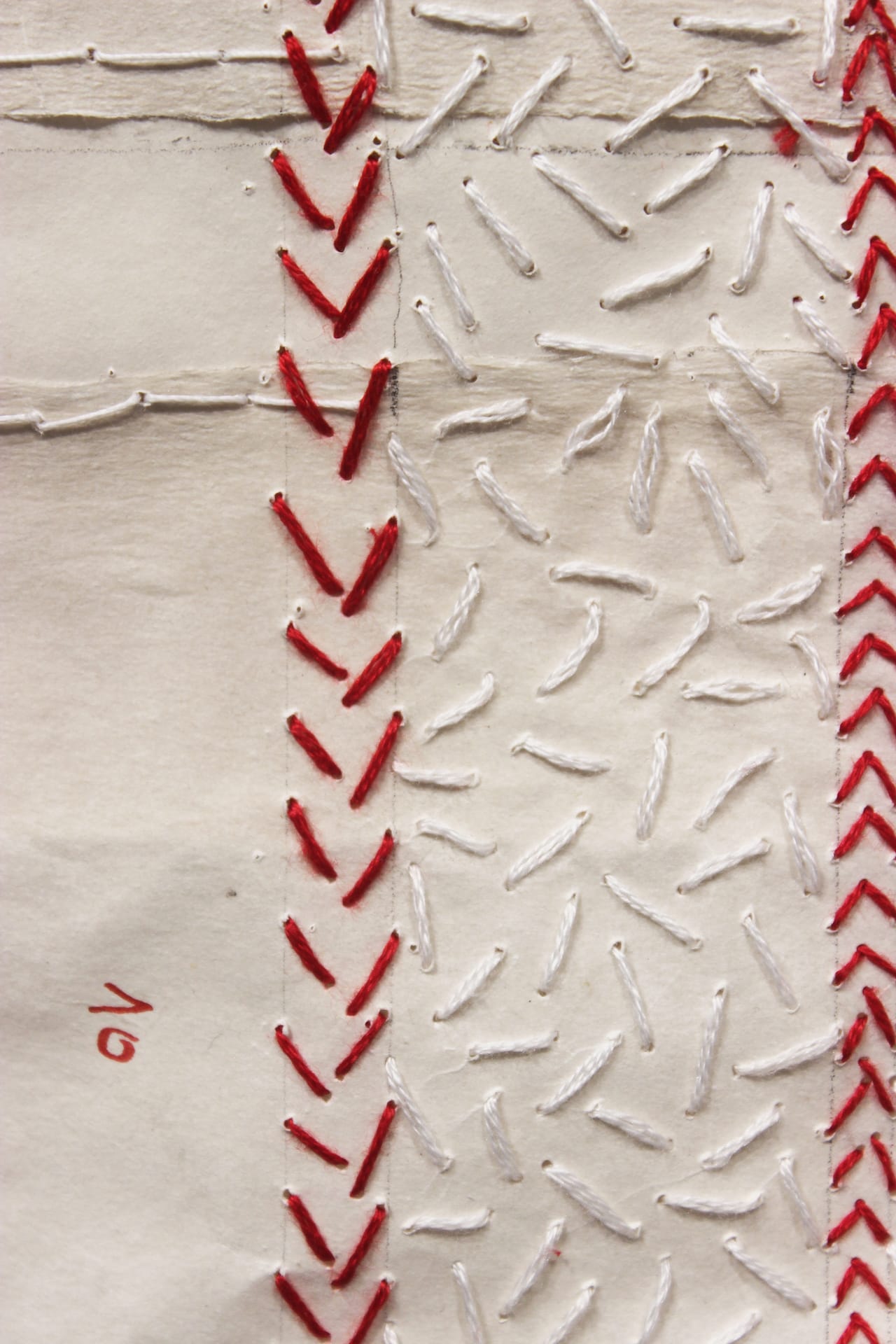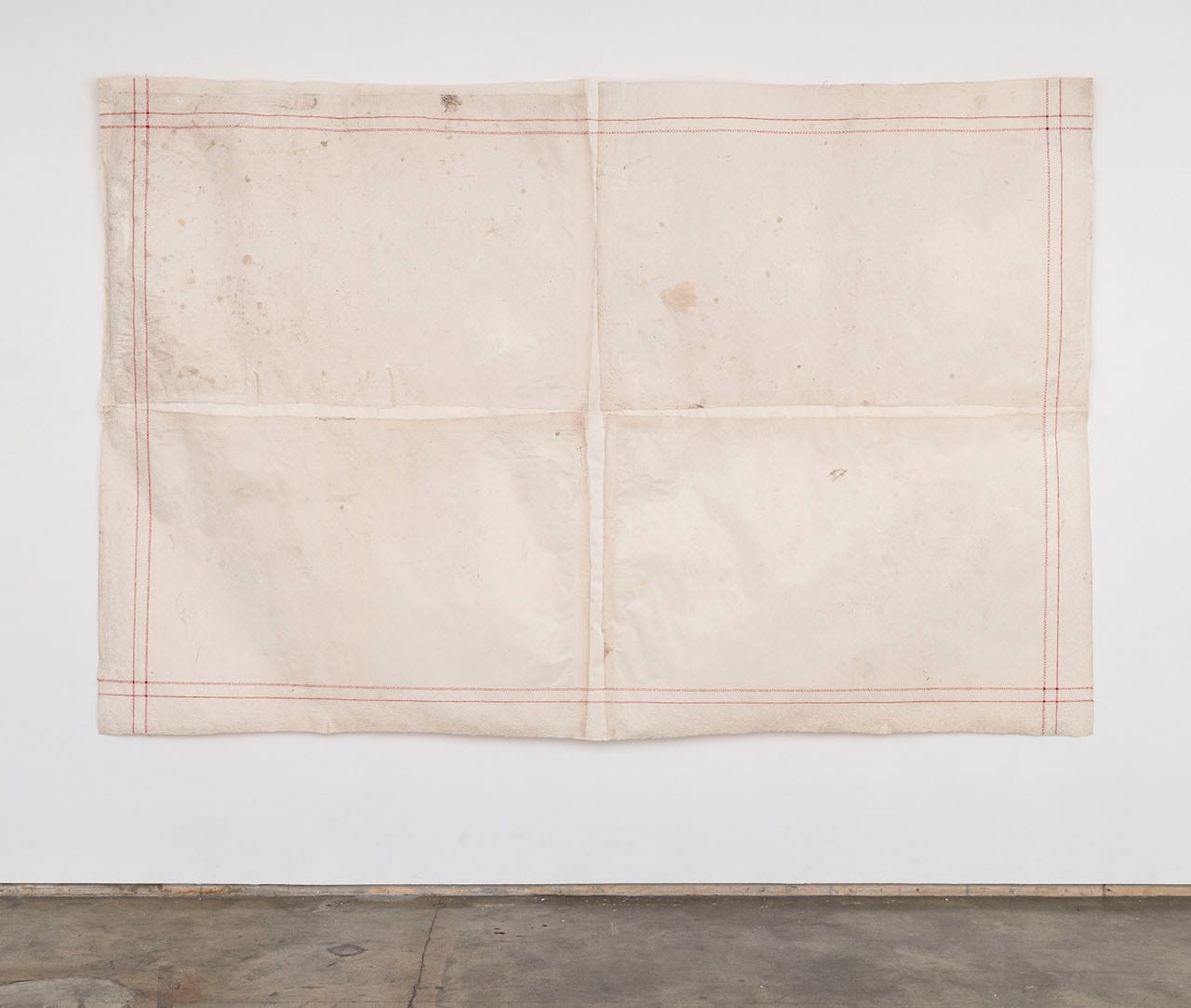 The red stitching highlights the rectangular lines, frames, and borders, but the paper does not lie perfectly flat; the surface bears slight creases and undulations throughout, but especially towards the center, where more repair work is evident. Hanging the work in such a conventional mode reveals the power, intimacy, and immediacy of its handworked, tenaciously repaired surface.