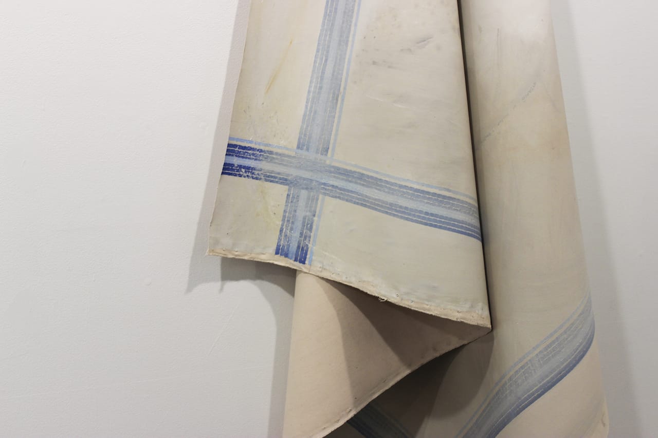 From the original 2001 exhibition, one of the original dishcloths and a smaller, unfinished one (completed for this exhibition) appear alongside these new works. The smaller work, a drawing on paper (Japanese Nishinouchi rather than Abaca) entitled “Letter from Home, RED_3” (2001-2015), hangs to the right of the gallery entrance. Del Rivero has sewn a red border of two parallel lines, one thicker than the other, on the outside of this drawing. The piece includes strips of paper sewn on each edge with lines of not-quite-legible text written in black ink. Here writing plays a significant part: in her new works, small pieces of writing can be found on the backs of the canvases, visible where they fold, but only on close examination. We see in these works del Rivero’s shift in the concept of a letter: she focuses increasingly on the object itself rather than on the actual writing.