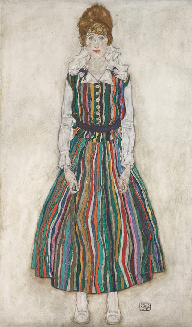 Like the subjects in his drawings, Schiele’s young wife Edith appears to hover inside the frame, with nothing connecting her to the physical edges of the surface. It’s as if he took the minimal backdrop of certain Edouard Manet paintings, such as “The Dead Toreador” (1864) and “The Fife Player” (1866), and eliminated the necessity of a floor. Edith’s hair, face, dress, arms, hands and feet are linear and modeled, tonal and coloristic. There is no border crossing between painting and drawing. Western compositional strictures are dispensed with; the fill-in-the-lines prismatic array on her striped dress is both sophisticated and naïve. A lightness of touch, so intrinsic to the drawings and so rare in the oils, is paramount; compared to “Portrait of the Artist’s Wife, Standing,” the other paintings in the show are overcooked and burned in the pan.