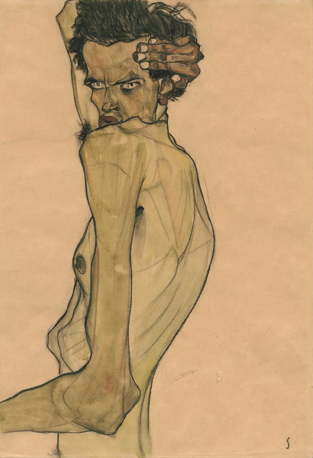 As sublime as this picture is, what feels more indicative of where Schiele might have gone if he had lived past his twenties is the set of harrowing self-portraits he made in 1912 while serving a 24-day jail sentence in the village of Neulengbach, where he went in search of solitude after a conspicuous lack of success in Vienna. In a story that’s becoming almost as iconic as van Gogh’s ear, Schiele, whose bohemian cohabitation with his then-mistress Wally (Valerie) Neuzil scandalized the town, was arrested on trumped-up kidnapping and rape charges. He was quickly cleared of those crimes, but not of “immorality,” an accusation that arose from some erotic drawings that had been seen in his studio by several of the village’s children.