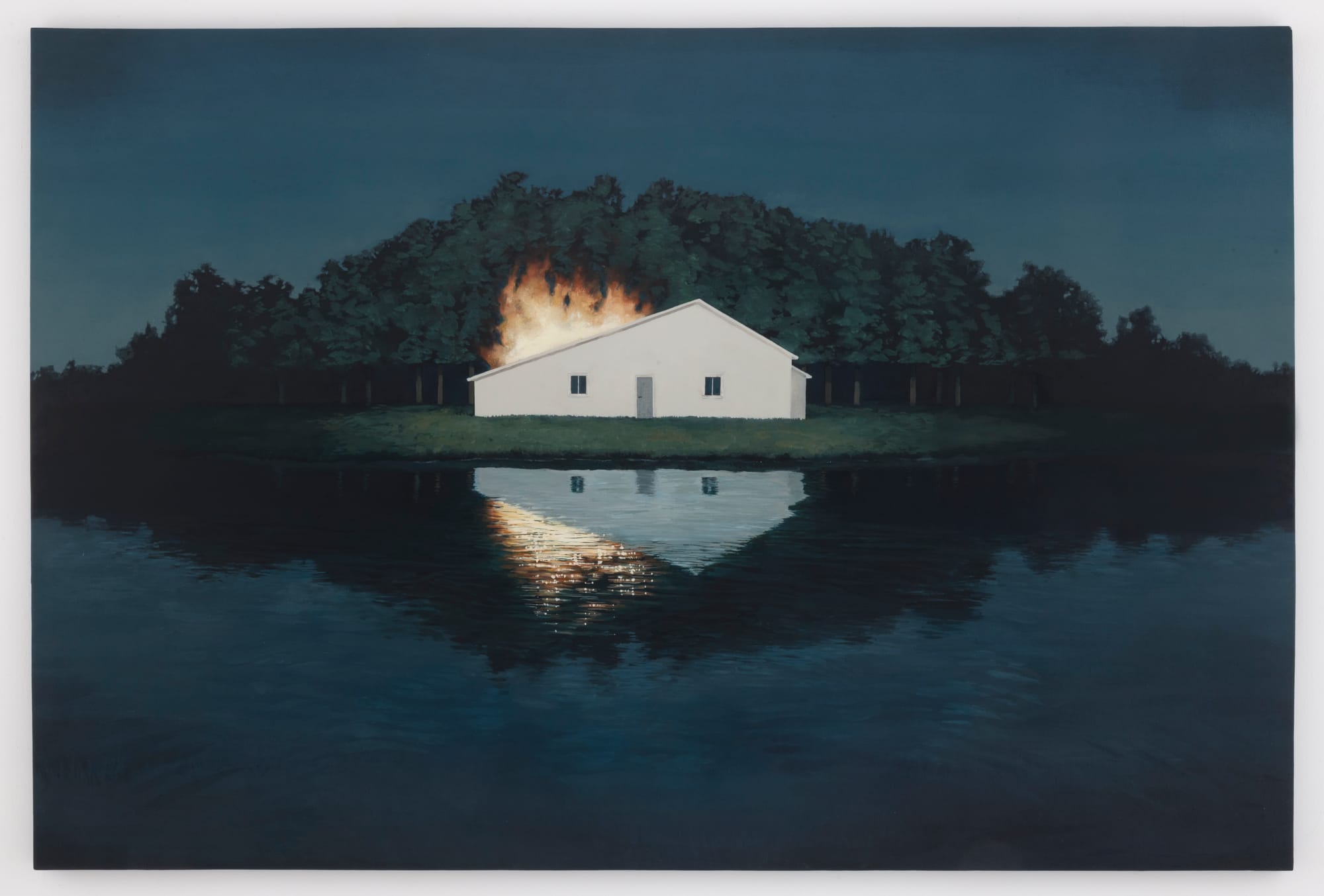 The fire paintings’ vantage points beckon aloofness. The burning objects are close enough so as not to appear remote, but not so close as to appear threatening. It’s the exact distance at which you can contemplate tragedy’s spectacle yet remain untouched by its damage. The foregrounds’ moat-like bodies of water reinforce this sense of distance between spectator and conflagration, which partly accounts for why the two fire paintings without bodies of water are less convincing (“Burning House” and “Fire,” both 2019). But the majority succeed in unique and uncomfortable ways.