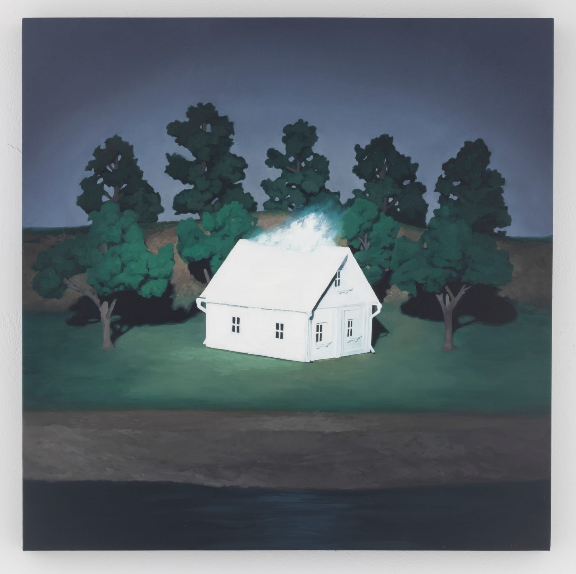 Fuzzy tufts of blue-white flame emanate from the roof of a bright white house. The flames create a halo of light around the house on an otherwise shadowy canvas, Motohide Takami’s “Fire on Another Shore (White)” (2019). This spotlight effect, along with the fact that the house and its surrounding trees have been painted from miniature models, makes the nighttime scene feel staged, as though its every compositional element were a prop in the fire’s drama. The ground’s horizontal bands of blue, green, and brown — used to differentiate the foreground river, mid-ground shore, and background sky — are also generic. They could be any river, any shore, any sky, just as the painting’s faceless house and cookie-cutter trees lack cultural specificity.