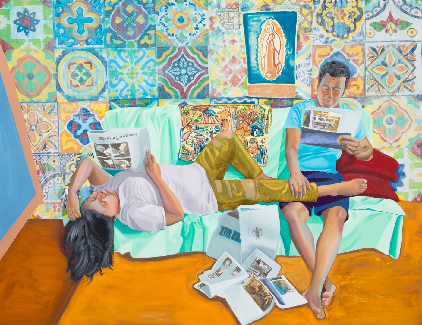 But the longer I looked at this work, the more I felt conscious of the separateness of its parts. Certain elements — namely, the pinned-up Virgin Mary calendar, the details of the front page of the New York Times, and the patterns of the decorative tiles comprising the backdrop of this interior — were more compelling than the figures. And yet, this is a painting of people.