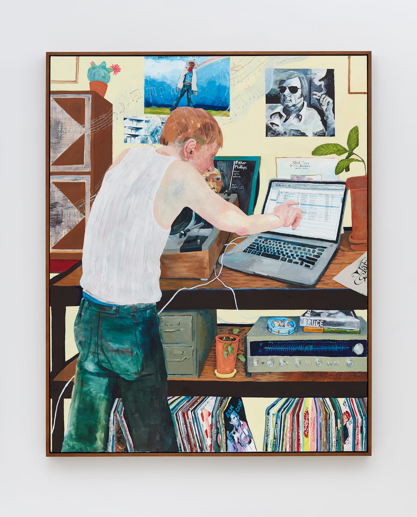 Dupuy-Spencer’s work is fun to look at, and she’s an accomplished draughtsperson. My favorite piece was “Fall with Me for a Million Days (My Sweet Waterfall)” (2016), where the pose of the guy huddled over his computer and shelves stocked with a turntable and vinyl albums, is a compelling, relatable image. But I wondered how it would look two years from now. The risk of too much time-sensitive detail, without an overarching container of human sentiment, is a short lifespan of relevance.