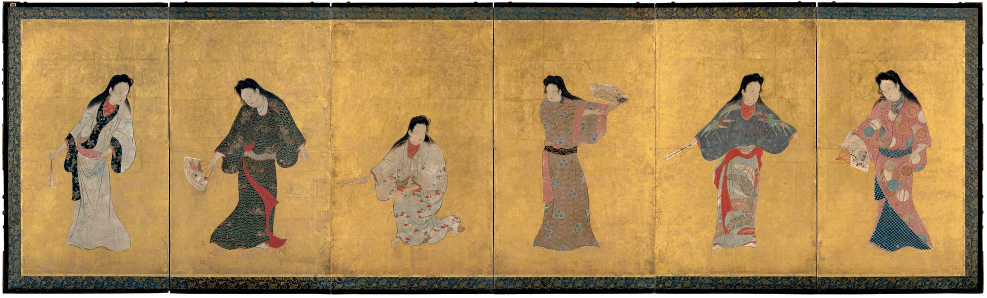 Yet a closer look at these screens reveals countless tiny scenes of ordinary people going about their lives: lighting lanterns, worshipping, smoking pipes, or simply talking in the streets. These figures indicate the new direction Japanese art was about to take over the next two centuries, its growing emphasis on daily life (a popular subject with the merchants in the thronging cities), and a corresponding move away from the representations of myth and heroic legend that dominated the art in temples and noble houses in earlier periods.