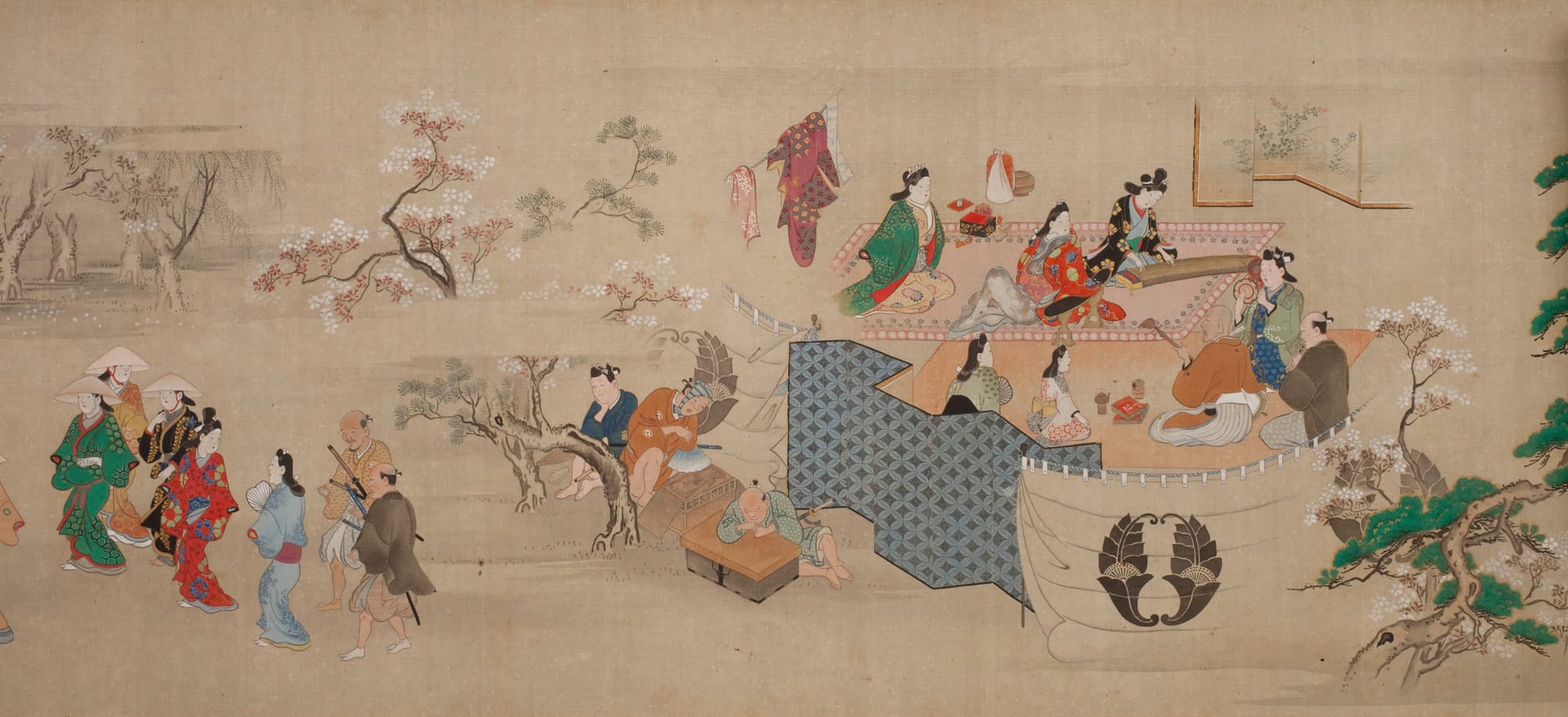 The subjects of these works include nigao-e (portraits of actors) and bijinga (portraits of famous beauties, often high-status sex workers of the pleasure districts and their attendants), as well as images of people enjoying the theater, making music, reading or writing letters, or in processions to view those most transient of beauties, seasonal cherry trees in blossom. They also include shunga, scrolls depicting sex acts between men and women, men and men, and (rarely) women and women. The Art Institute handles these scrolls with some discretion, laying them flat in narrow spaces behind larger painted screens, so the exhibit remains appropriate for all ages.