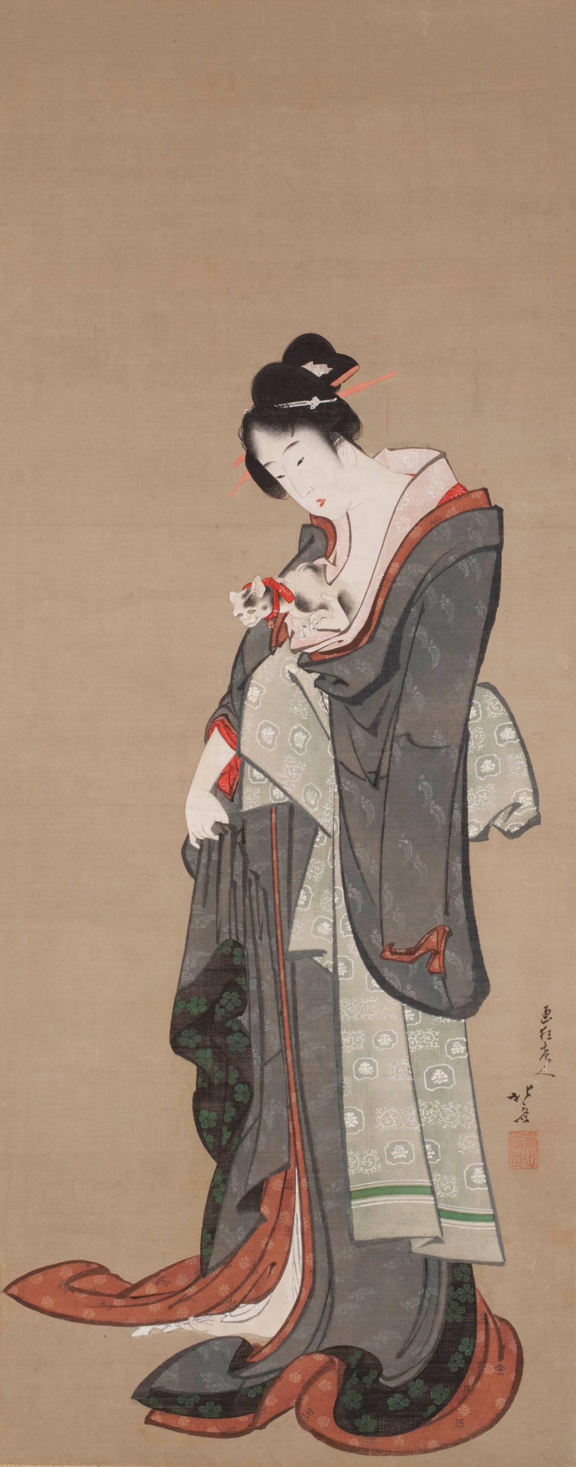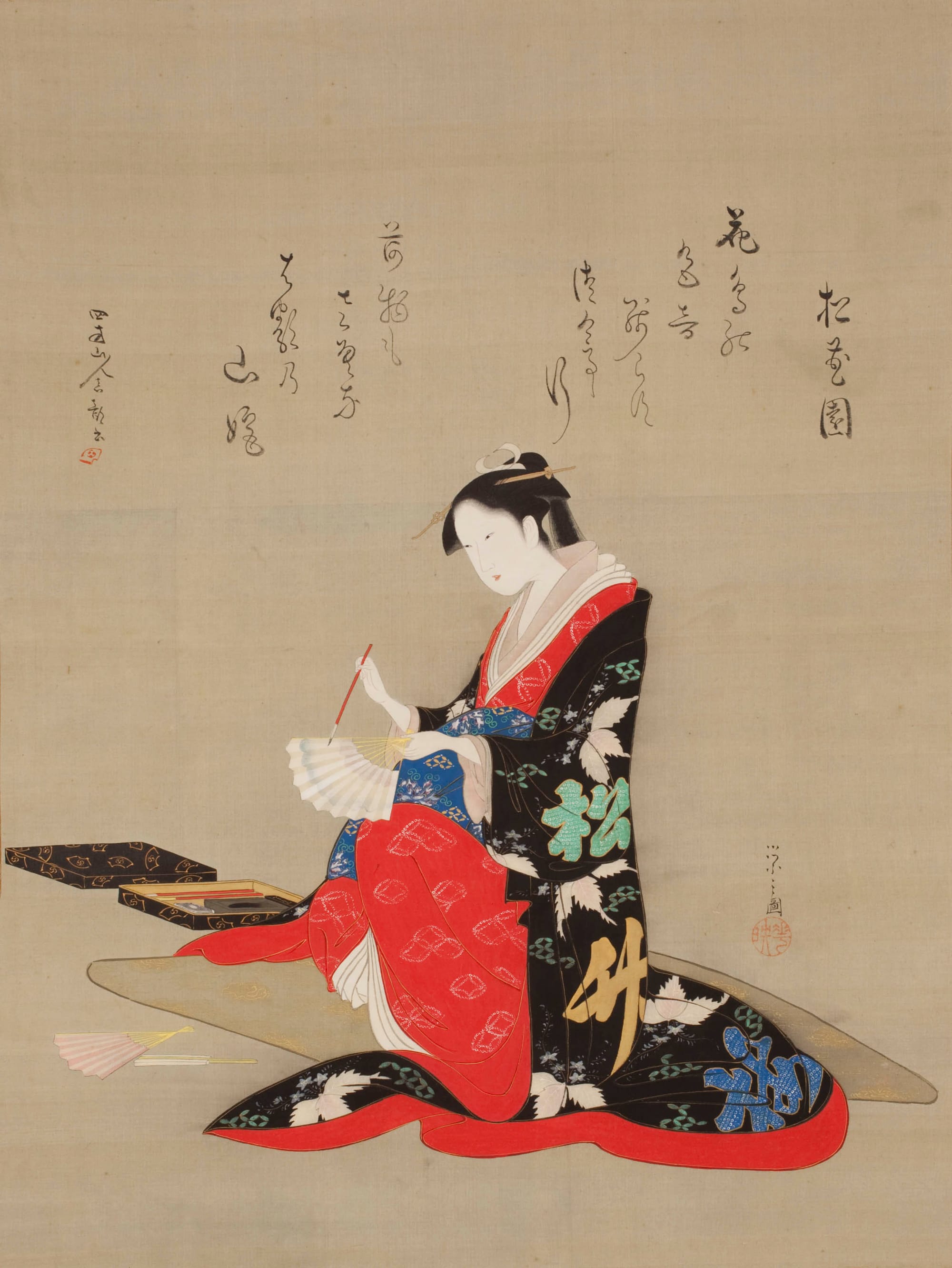 The images painted for these urbanites overwhelmingly depicted people: landscapes are of far less importance than the figures, and backgrounds are often either suggested by a few brushstrokes or absent altogether. When men were depicted, as in the case of nigao-e (women were forbidden to take the stage), they were often individualized, with characteristic large ears or asymmetrical eyes clearly reproduced. Such was not the case for women, who tended to be idealized in accordance with the norms of the period — although inscriptions and known mannerisms often identified the image with an individual rather than a social type. Such idealization signals that men commissioned these images. Courtesans’ poses in images likewise suggest a heterosexual male viewer: the women are frequently undressing or dressing, both acts implying intimacy, and the typical gesture of bijinga is the flirtatious or alluring backward glance over the shoulder.